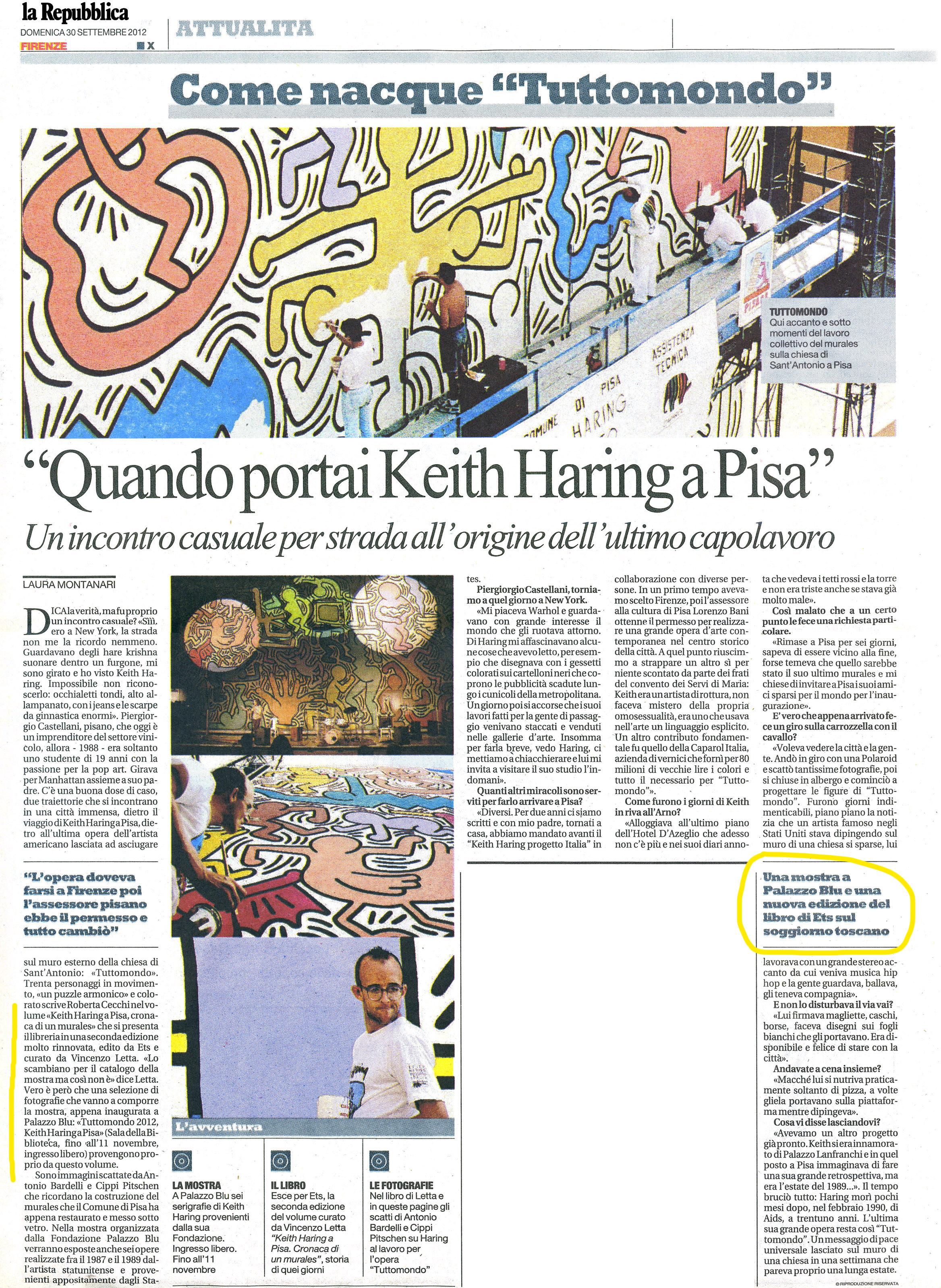 ITA-ENGLISH text con testi di: Roberta Cecchi, Piergiorgio Castellani, Carlo Venturini, Andrea De Gioia fotografie: Antonio Bardelli e Cippi Pitschen Nel giugno del 1989, sulla parete posteriore della Chiesa di Sant’Antonio di Pisa, il grande artista newyorchese Keith Haring realizzava l’ultima opera pubblica della sua vita, il murales Tuttomondo. Il libro vuole raccontare la realizzazione di quell’opera, e rendere un simbolico omaggio a Haring e al suo murales, da molti ritenuto un testamento spirituale. Questa seconda edizione viene ulteriormente arricchita attraverso una panoramica di eventi e situazioni che raccontano come la città di Pisa vive il murales. Dalle contaminazioni artistiche agli interventi di protezione, dagli happening musicali e multimediali all’intervento di restauro, fino all’intitolazione a Haring della piazza dove si trova il murales. In June 1989, on the rear wall of the convent of the Church of Sant’Antonio in Pisa, the great New York artist Keith Haring created the last public work of his life, the mural Tuttomondo. This book recounts how the work was done as a way of honouring Haring and his mural, thought by many to be his spiritual testament. This second edition has been supplemented with an overview of events and situations illustrating the relationship that has developed between the city of Pisa and the mural. They range from artistic offshoots to safeguarding measures, musical and multimedia happenings to the restoration project, up to the re-naming of the piazza where the mural is located in Haring’s honour.
