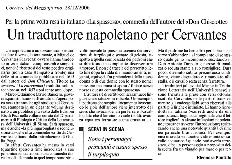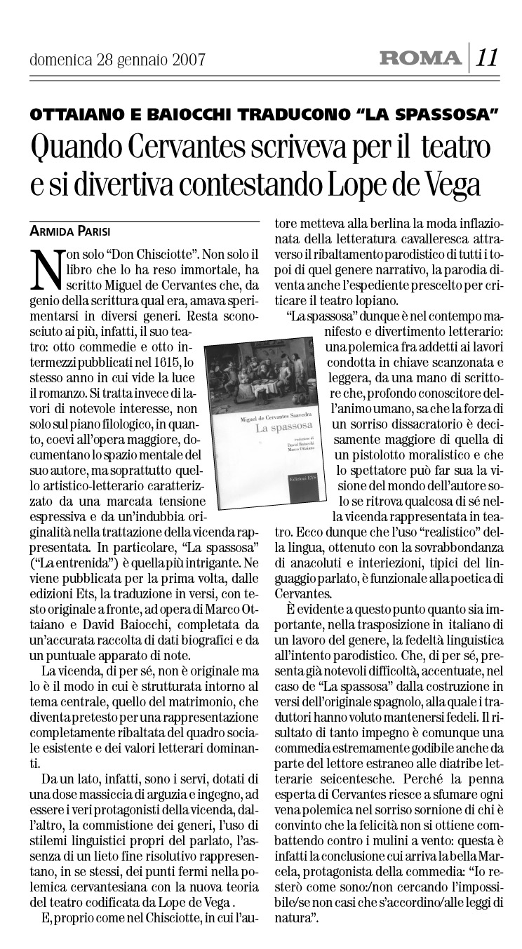 Tutti sanno che Cervantes è l'autore del Don Chisciotte, ma non tutti conoscono il suo teatro, le otto commedie e gli otto intermezzi pubblicati l'anno stesso in cui vide la luce la seconda parte del suo celebre romanzo (1615). La spassosa (La entretenida) è una fra le commedie più enigmatiche. Costruita su una trama a più fili in cui i servi hanno un ruolo preponderante, si distingue per il suo stile accentuatamente parlato che ricorda da vicino i canovacci della commedia dell'arte. Come si accenna nell’introduzione di Giulia Poggi, la commedia è percorsa da una vena polemica, quando non apertamente parodica, nei confronti dell'innovatore del teatro coevo, Lope de Vega. Non a caso, nonostante le numerose storie d'amore che ne intessono il divertentissimo intreccio, si conclude con un finale a sorpresa, senza alcun matrimonio. INFO: http://www.edizioniets.com/anteprime/Cervantes_Spassosa