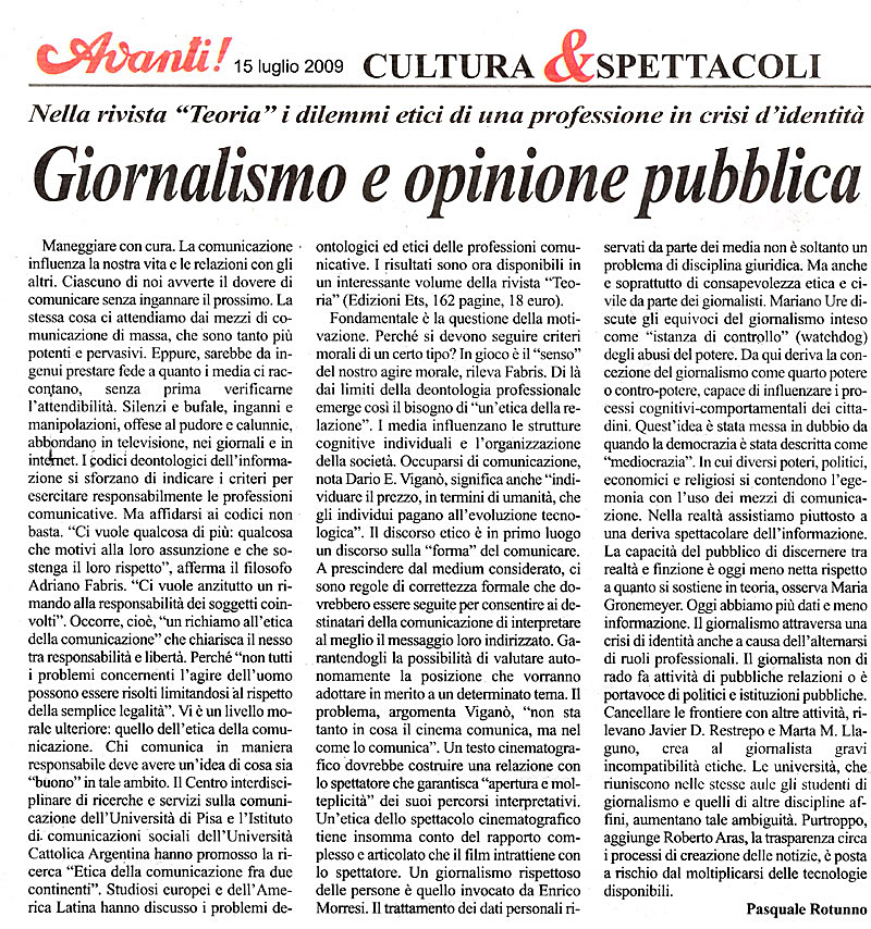 Scritti di: Adriano Fabris, Giovanni Manetti, Mariano Ure, Francisco José Castilhos Karam, Enrico Morresi, Javier Dario Restrepo, Roberto Aras, Marta Martín Llaguno, María Elena Gronemeyer, Dario E. Viganò