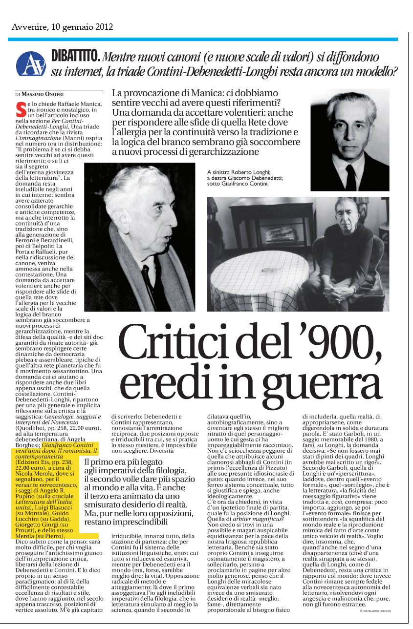 A coronamento del convegno che si è tenuto all'università della Calabria a vent'anni dalla scomparsa di Gianfranco Contini (1912-1990), questo libro intende ricordare il talento, la passione e l'operosità del grande studioso, che nel suo celebrato magistero riuscì a conciliare felicemente competenze eminenti di filologo e critico letterario, ottenendo risultati memorabili sia come editore e commentatore dei poeti del Duecento, di Dante e di Petrarca, sia come interprete acutissimo e precoce dei maggiori scrittori del Novecento, da Ungaretti a Montale, a Gadda, senza trascurare i saggisti, da Croce a Longhi, a Debenedetti. Interrogarsi oggi su Contini, che con la sua indiscussa autorità contribuì in maniera decisiva all'avvento della grande stagione della critica e ha assistito solo all'inizio del suo declino, significa anche tornare a porre sul tappeto la questione del ruolo degli studi letterari nel nostro sistema formativo e nella cultura contemporanea. Con testi di Stefano Agosti, Roberto Antonelli, Ottavio Besomi, Luigi Blasucci, Claudio Ciociola, Anna Dolfi, Luciano Formisano, Giorgetto Giorgi, Guido Lucchini, Clelia Martignoni, Maria Luisa Meneghetti, Nicola Merola, Angelo R. Pupino, Cesare Segre.