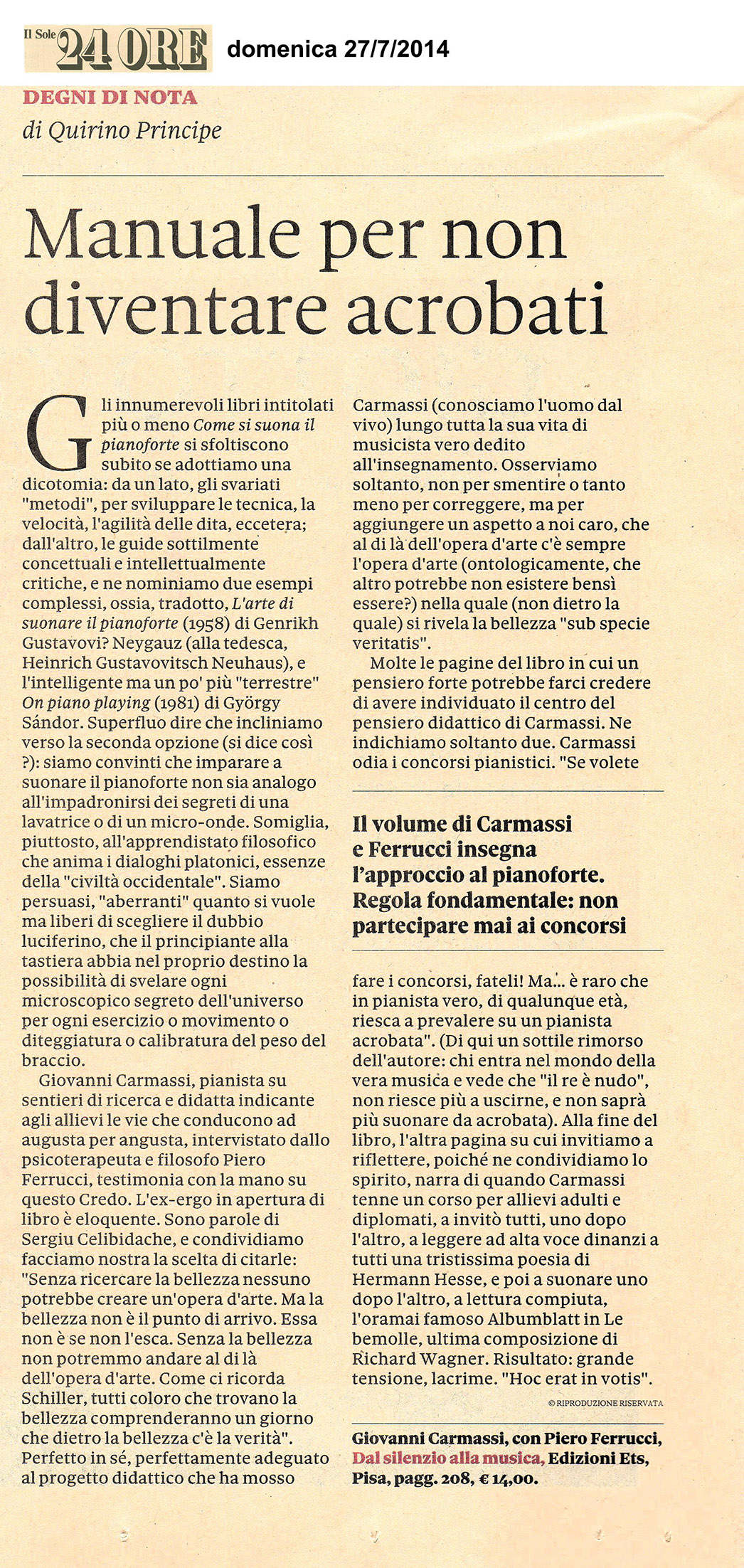 Dialogando con Piero Ferrucci, il maestro Giovanni Carmassi illustra il nucleo essenziale della sua impostazione pianistica: prima di essere eseguito, il pezzo musicale deve essere ideato e costruito nella mente del musicista. Nei vari capitoli sono esaminati i capisaldi su cui si basa l’arte del pianoforte: