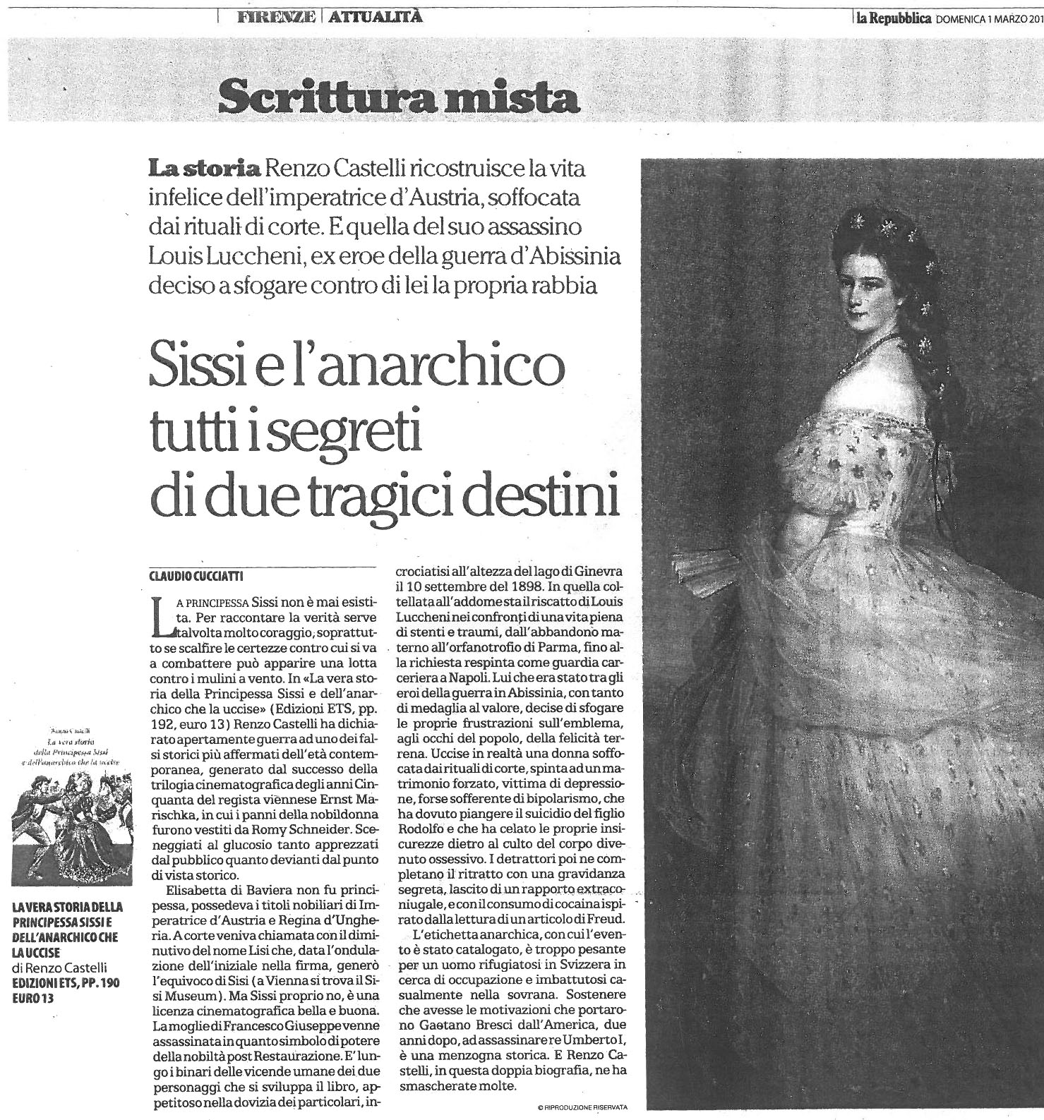 Elisabetta di Baviera, imperatrice di Austria e regina d’Ungheria, non fu infatti mai ‘principessa’, essendo stata duchessina e poi imperatrice, né alcuno la chiamò mai in vita con il vezzeggiativo di ‘Sissi’. Altri elementi della narrazione distorcono l’intera vicenda. Lo stesso anarchico che la uccise, pugnalandola sulle sponde del lago di Ginevra, non fu mai un ‘vero’ anarchico ma un giovane disperato e gonfio di rancore. Elementi più che sufficienti per una rivisitazione delle vicende che videro protagonisti una donna la cui figura fu ben più complessa e contraddittoria di quanto quei film mostrassero e un uomo che fu vittima del suo terribile passato.