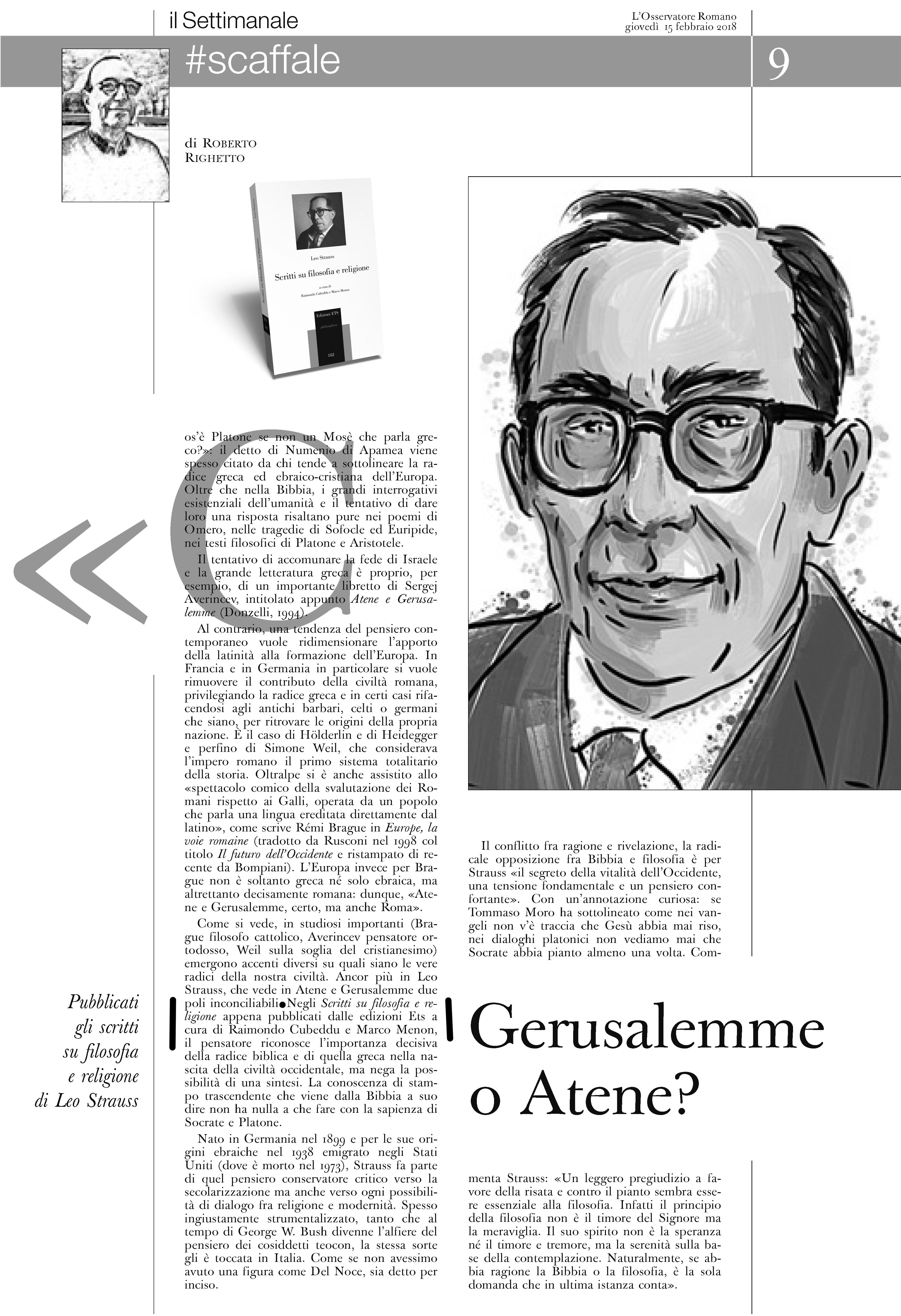 Questo volume presenta per la prima volta al pubblico italiano, alcuni scritti di Leo Strauss sul problema teologico-politico, ovvero sull’alternativa fra Gerusalemme e Atene. La loro importanza risulta evidente alla luce del rilievo che Strauss ha attribuito alla contrapposizione tra filosofia e rivelazione e degli interrogativi sul suo personale rapporto con la religione. La raccolta permette dunque di farsi un’idea più precisa sull’importanza della questione attraverso il confronto con i principali testi in cui Strauss affronta un problema che ritiene fondamentale.