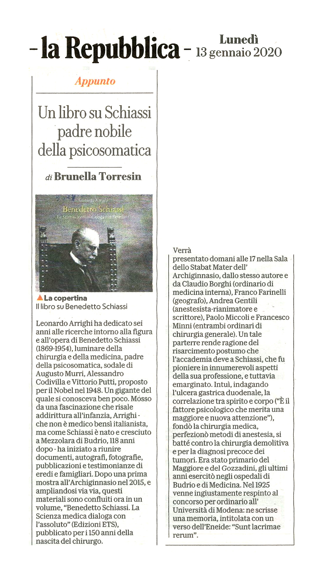 Questo volume riporta alla luce l’esistenza del chirurgo bolognese Benedetto Schiassi (1869-1954), approfondendone le dinamiche professionali ed umane, offrendo riflessioni che spaziano dalla scienza medica, alla filosofia e alla storia. «Padre mondiale della psicosomatica», ideatore e autore di interventi innovativi, tra cui la deviazione chirurgica del sangue portale, la vagotomia selettiva, la broncotomia attraverso il mediastino, la splenocleisi, la colecistendesi e la ricostruzione dello stomaco, Schiassi – candidato al Premio Nobel nel 1948 – si impone come alfiere della chirurgia, vissuta come pratica volta alla rifunzionalizzazione di organi e apparati. Gli oltre 40000 interventi, le numerose pubblicazioni e i rapporti con altri colleghi – in particolare Augusto Murri, Pietro Albertoni, Alessandro Codivilla, Vittorio Putti, Harvey Cushing e Julius Spivack – tracciano la fisionomia di un periodo storico cruciale per il progresso sociale, culturale, tecnologico e denso di innovative conquiste mediche. Amante della letteratura, dell’arte e della filosofia, il chirurgo italiano riemerge per la multiformità della sua visione scientifica ed umanistica. Scomodo per i suoi contemporanei e dimenticato dai posteri, Schiassi può ora, attraverso questo volume, rivendicare a buon diritto il suo posto nella storia della medicina.