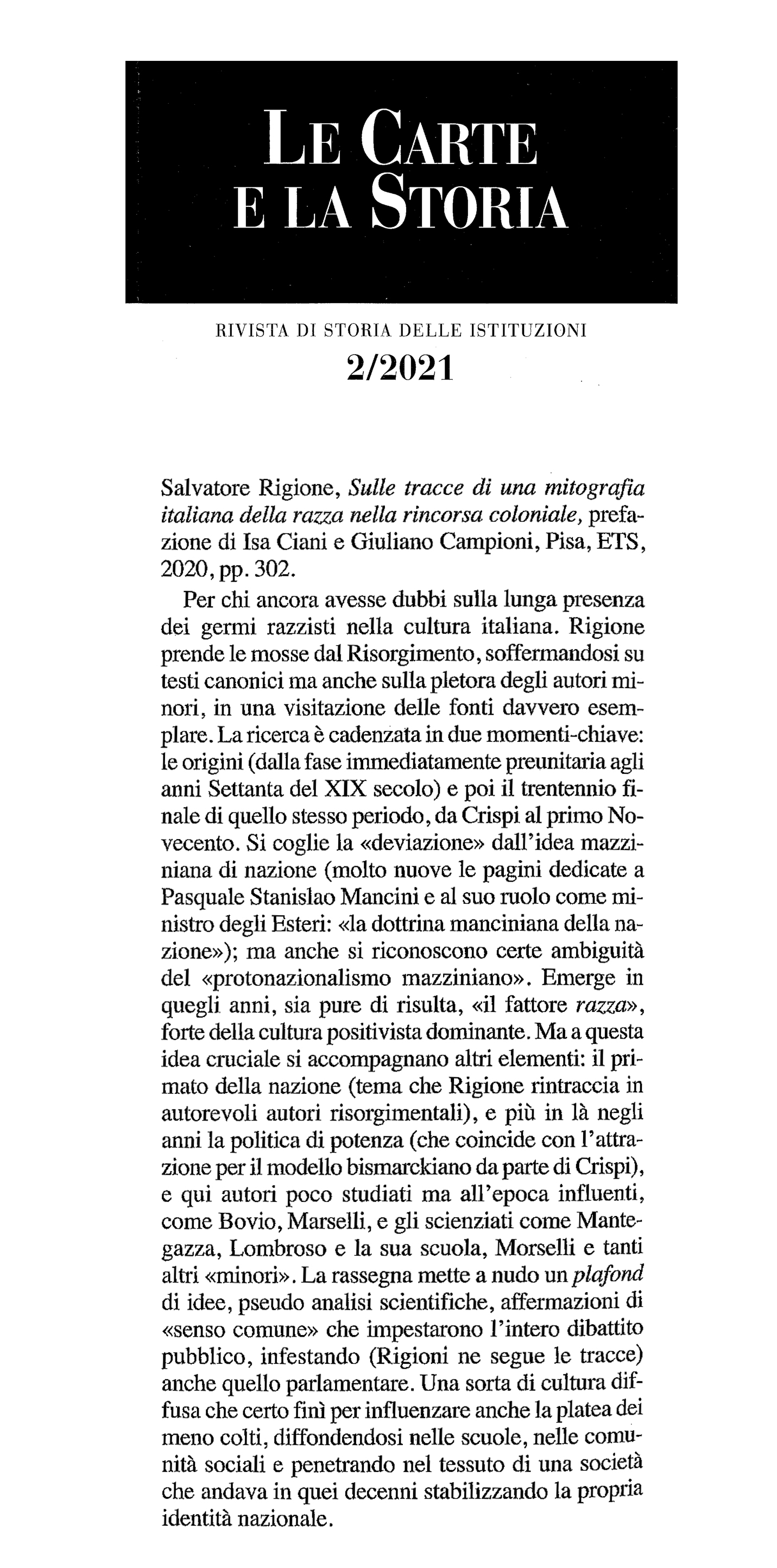 Questo libro affronta le distinte narrazioni del lemma razza dalla formazione risorgimentale dello Stato agli albori del nazionalismo, includendo le istanze della politica italiana di potenza. Dalla puntuale rilettura di testi fondamentali emergono le posizioni di figure rilevanti del Risorgimento e della fase postunitaria: Mancini e Mazzini, Gioberti, Balbo e Campo Fregoso, Bovio e Marselli, poi gli antropologi Mantegazza, Lombroso e Sergi fino a Morselli. Si mettono inoltre in risalto i protagonisti della lotta per la seconda emancipazione ebraica e valdese e, sul fronte dell’antirazzismo, Ghisleri e il suo gruppo, Colajanni e il dreyfusardo Paulucci di Calboli fino a Mondaini. Attraverso queste diverse prospettive Rigione delinea così i tratti diversificati di una «mitografia italiana della razza», rappresentando il lascito teorico più gravido di conseguenze del laboratorio politico italiano tra la fine dell’Ottocento e il primo decennio del Novecento, che confluirà nel nazionalismo imperialistico e nel razzismo fascista.