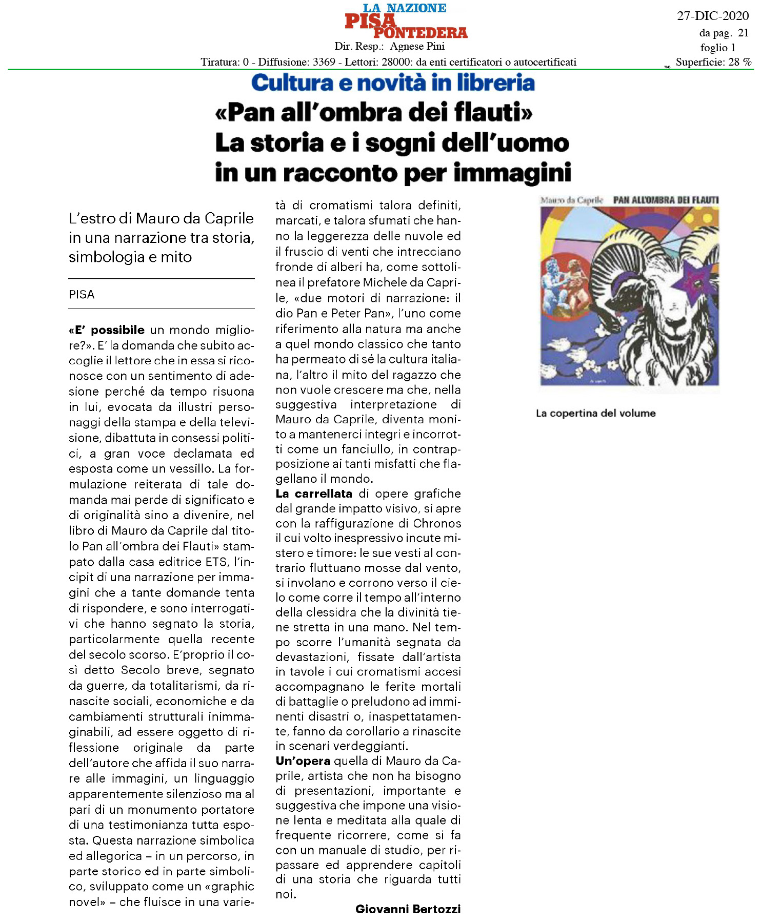 E' possibile un mondo migliore? Quale umanità è uscita dagli ultimi, “lunghissimi”, cento anni di storia? Quale rapporto tra l'uomo e la natura? Sono proprio questi, gli interrogativi che muovono la narrazione per immagini del libro di Mauro da Caprile. L'autore ce ne suggerisce una possibile soluzione attraverso un percorso, in parte storico ed in parte simbolico, sviluppato come un “graphic novel”. L'ultimo secolo di avvenimenti costituisce l'orizzonte temporale, in buona parte anche autobiografico, scelto da Mauro per la sua riflessione per immagini. Ne vengono ripercorsi molti momenti e snodi significativi: le due guerre mondiali, i totalitarismi – in primis il Fascismo – la ricostruzione ed il cosiddetto “boom economico” del secondo dopo guerra italiano, la “cortina di ferro” ed il mondo diviso tra le due superpotenze USA e URSS, la globalizzazione economica e culturale, le devastazioni ambientali, i nuovi mezzi di comunicazione di massa, la digitalizzazione. Si tratta di un percorso visivo e didascalico coinvolgente, di un'avventura nel tempo e nello spazio, al confine tra sogno e realtà. Evocazioni mitologiche,scenografiche storiche e di fantasia, costituiscono il linguaggio di Mauro da Caprile. La luce, l'armonia cromatica ed il ritmo, rendono visionaria e fantastica la narrazione. Per compiere questo viaggio, all'interno del quale si compenetrano e si mischiano le esperienze, le emozioni del vissuto e del mondo interiore dell'autore, con i fatti storici e sociali, Mauro ha scelto due protagonisti simbolici; due motori della narrazione: il dio Pan della mitologia classica e Peter Pan, il personaggio nato dalla penna del romanziere scozzese James Barrie. Pan o Fauno è un'ancora gettata verso la classicità, riferimento sempre presente nella nostra cultura di italiani; una spinta a cercare l'equilibrio, la rassicurante evidenza delle nostre radici. La divinità silvana è, inoltre, simbolo positivo di un armonico rapporto con la natura e con le creature che la abitano; amante della musica. Peter Pan, l'eterno fanciullo, è riletto allegoricamente non come sintomo di immaturità, oppure come paura di crescere e diventare adulti, bensì come il tentativo di mantenerci puri, incorrotti, rispetto alle distruzioni, ai mali ed alle perversioni del mondo moderno. Peter che è, ad un altro livello di lettura, anche un alias autobiografico di Mauro, attraversa con la sua ombra delicata l'ultimo secolo di storia, cercando di non farsene contaminare. La purezza, nel rapporto con sé stessi e nel rapporto con le altre forme di vita, può consentirci di rappresentare un esempio positivo; uno stimolo a risolvere i problemi che affliggono l'umanità attraverso una testimonianza, uno stile di vita.
