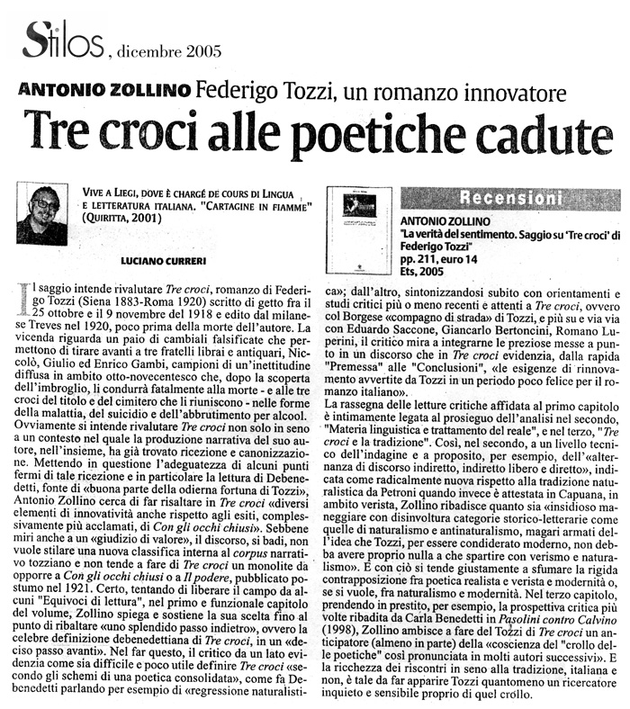 Per quanto la maggioranza dei pareri critici correnti tenda ad esaltare la qualità e la sostanza innovativa di Con gli occhi chiusi, "Tre croci" risulta a tutt’oggi uno dei romanzi migliori di Tozzi e, in assoluto, una delle opere più interessanti del primo ventennio del Novecento, ovvero di un periodo di oggettiva crisi del romanzo che patisce, dopo l’esaurimento delle esperienze veriste e simboliste, la condanna delle poetiche vociane e, in parte, futuriste. "Tre croci" tenta di superare un simile impasse avvalendosi dell’integrazione di tecniche e strutture provenienti dagli ambiti di competenza di tradizioni narrative più o meno recenti, le cui rispettive acquisizioni risultano conciliate in una forma essenziale e «compatta» in grado di rimandare non solo ai referenti di una realtà esteriore, ma anche a quelli assai meno definibili della realtà interiore: della «realtà» o «verità del sentimento», per usare termini tozziani. Né «naturalista» né «espressionista», come vorrebbero in contrapposizione fra loro due affermate linee interpretative del romanzo, "Tre croci" è invece il risultato di un notevole lavoro di sintesi fra diversi modi di concepire la scrittura e rappresenta, per certi aspetti, un notevole «passo avanti» sia rispetto alle soluzioni meno «concentrate» e più analitiche di Con gli occhi chiusi, sia nella storia del romanzo italiano del primo Novecento, dove può rivestire una funzione di cerniera fra la stessa tradizione del genere e le sue forme più innovative e aperte alla complessità del reale. Per dare corpo al nucleo di una simile tesi, l’autore ha inteso rilevare le numerosissime trafile intertestuali che convergono nella tessitura di "Tre croci", così complesse e variegate da smentire ogni tentativo di lettura univoco e totalizzante del romanzo. Alla luce della presente ricerca "Tre croci" appare, o forse torna ad apparire, come un’opera fondamentale della maturità tozziana.