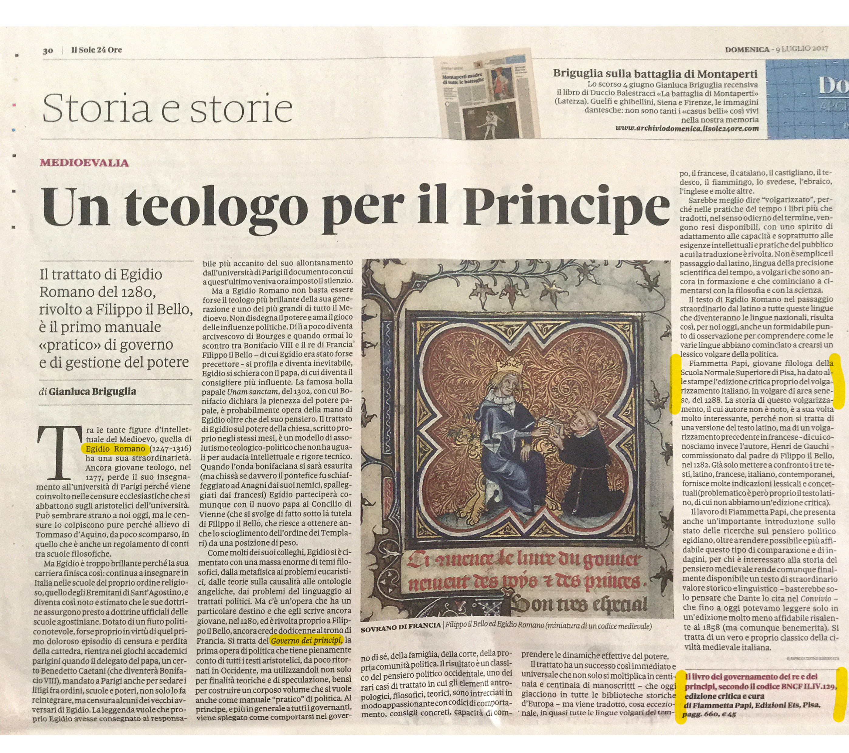 Composto da Egidio Romano intorno al 1280, e dedicato al giovane erede al trono di Francia (il futuro Filippo IV il Bello),il De regimine principum è una delle opere più fortunate del basso Medioevo. Il trattato, suddiviso in tre libri rispettivamente dedicati alla disciplina dell’individuo (l’etica), della casa (l’economica) e dello stato (la politica), fu tra i primi specula principis occidentali a essere esplicitamente basato sulle opere di Aristotele.