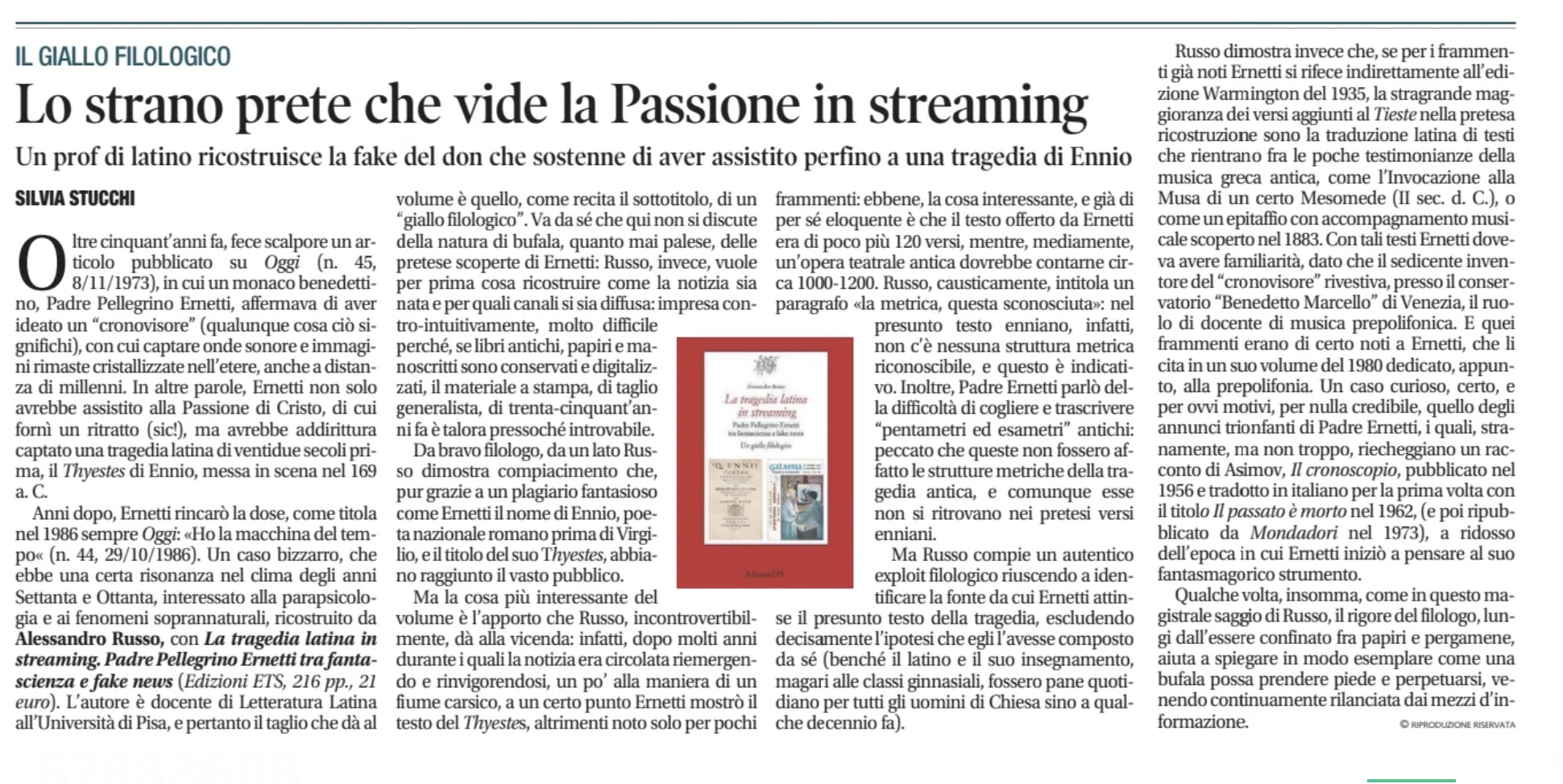 «Captata attraverso lo spazio una tragedia di 22 secoli fa»: con questo titolo a caratteri cubitali a tutta pagina un rotocalco italiano, nell’ottobre del 1973, rilanciava con grande evidenza una storia caratterizzata da un insolito mix di elementi fantascientifici ed eruditi e che continua ad avere una incredibile fortuna a livello mondiale nella pubblicistica popolare nonché in innumerevoli siti sulla rete: un monaco benedettino, padre Pellegrino Ernetti (1925-1994), grazie a una macchina del tempo, affermava di aver assistito alla prima rappresentazione di una tragedia del poeta latino Quinto Ennio (239-169 a.C.), che si tenne a Roma nel 169 a.C., e di averne così ricostruito per intero il testo che, come quello della quasi totalità delle altre opere latine di quell’epoca, era andato perduto.