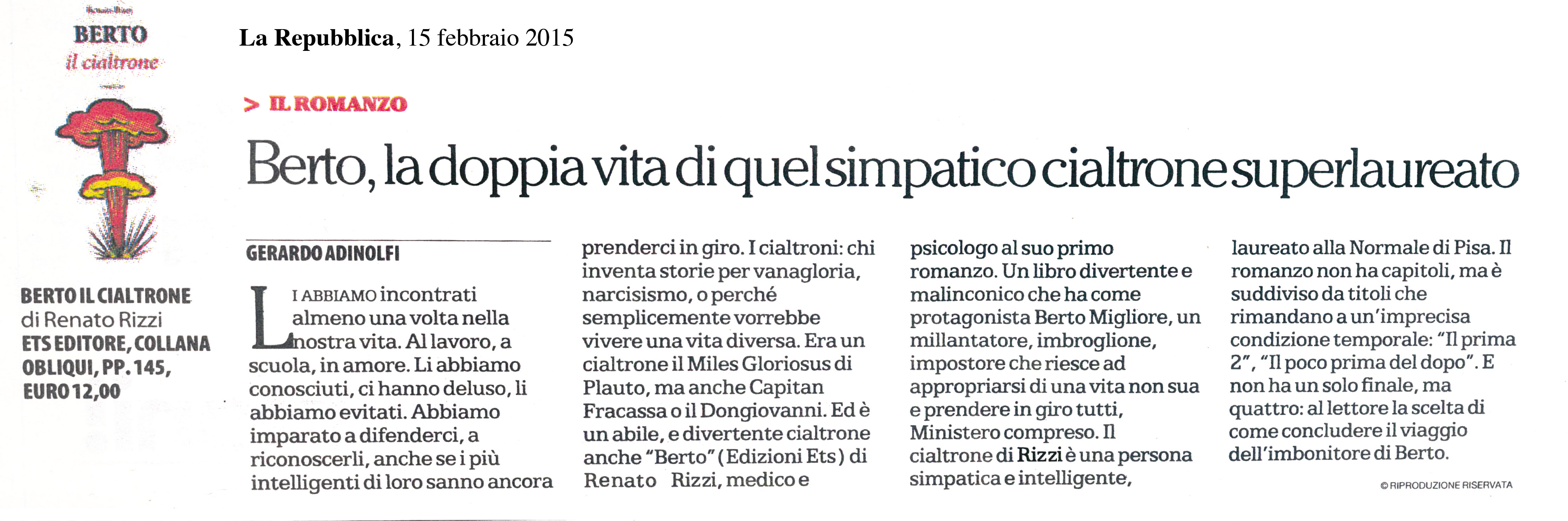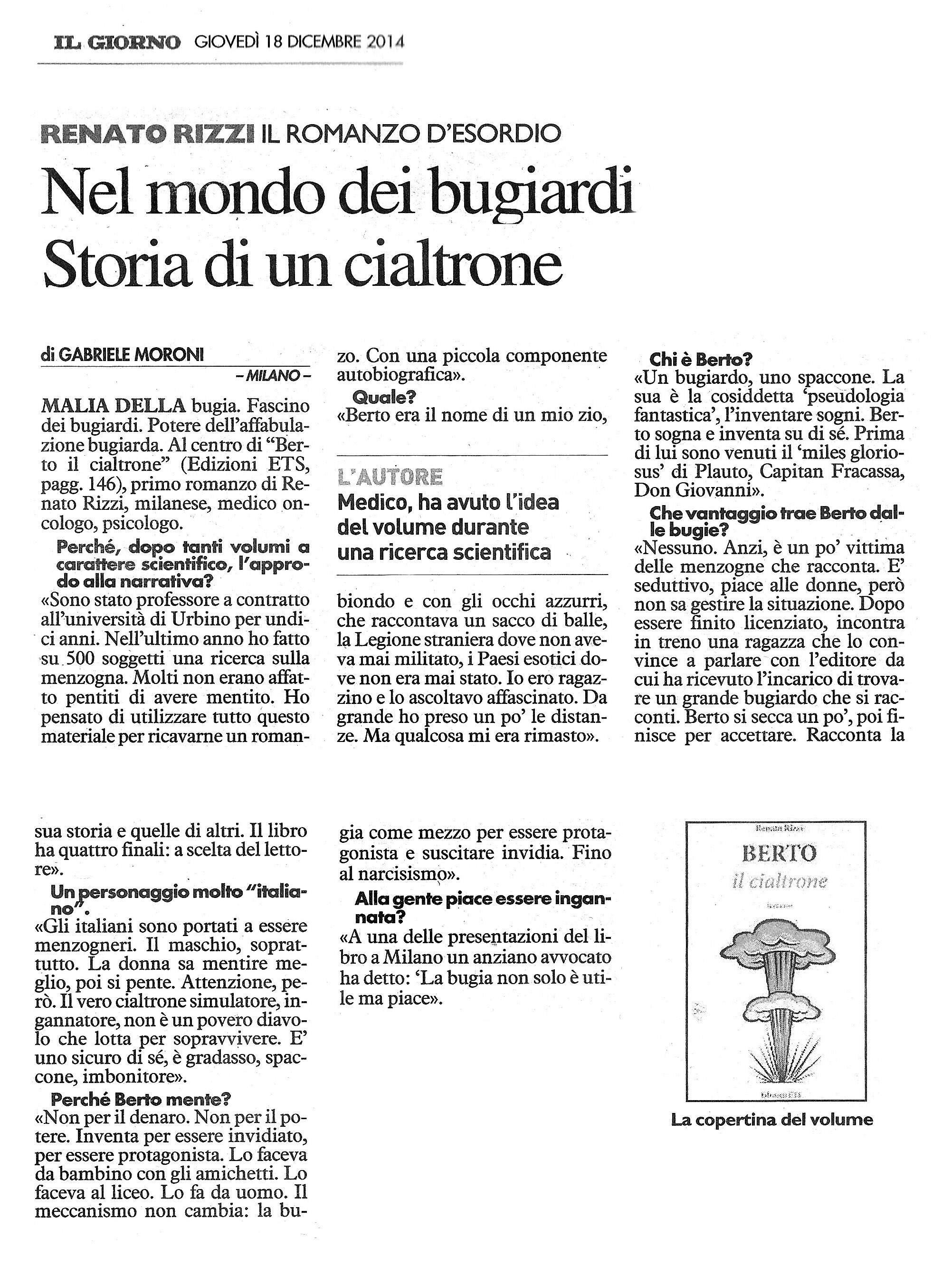 Tutti noi li abbiamo incrociati, i professionisti della ‘sparata’: giornalisti inventa notizie, laureati senza laurea, campioni senza coppe. Berto, protagonista di questo romanzo, è uno di questi cialtroni. Simpatico, seducente, abile: sempre impegnato ad ‘abbellire’ le sue storie, interpretando un personaggio talentuoso con trascorsi misteriosi, ma a tratti anche commoventi.