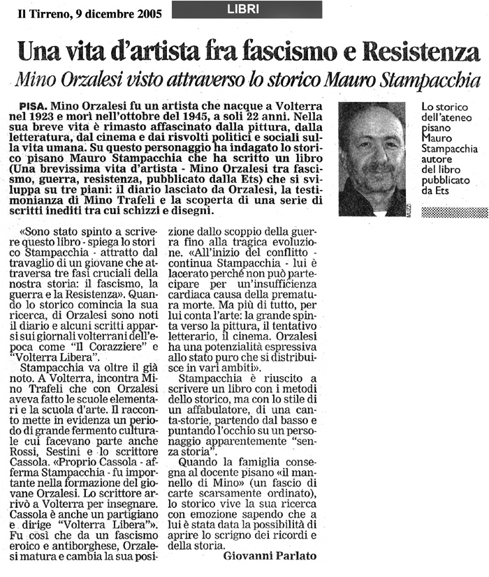 Mino Orzalesi, giovanissimo artista di talento e di inquietudine, attraversa con i suoi progetti e i suoi eroici furori, confidati ad un diario, il periodo forse più drammatico e controverso della storia contemporanea italiana. Dubbioso, a volte incerto, a volte ancora drammaticamente lacerato, limitato nei suoi sogni da una precoce malattia, Mino sceglie di percorrere comunque ad occhi aperti e senza compromessi, quale fosse il dolore del vivere e del sopravvivere, della guerra e delle scelte della Resistenza, la parte di vita che gli è concessa, nel microcosmo della amata-odiata Volterra che riflette il macrocosmo di un mondo in tragedia. Lo fa tenendo sempre alta la capacità espressiva, che, se per lui si traduce in origine nel disegno, nella pittura, nella scultura, si estenderà poi, per tentativi, alla critica cinematografica, alla poesia, al racconto, alla notazione politica e sociale. Lo ferma solo la prematura morte, quando ancora si doveva delineare la nuova Italia nella quale Orzalesi aveva, come tantissimi, riposto le sue speranze.