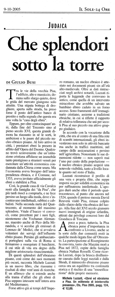 ITA-ENGLISH text Per tutto il corso del secondo millennio dell’era volgare, o poco più o poco meno, ebrei residenti a Pisa celebrarono, anno dopo anno, e forse con la sola eccezione del terribile 1943-1944, i sabati e le feste del loro calendario liturgico. Ma, ogni volta, gli ebrei che si riunivano in queste occasioni rituali erano raramente gli stessi degli anni precedenti, o i loro figli, o i figli dei loro figli. Si contano infatti sulle dita di una mano le famiglie ebraiche che poterono, o possono, vantare una permanenza a Pisa superiore ai due secoli. La continuità dell’insediamento ebraico nella città si basa dunque su una sorta di “staffetta” fra gruppi di diverse origini che dopo qualche decennio di residenza lasciavano il posto ad altri ebrei che sopravvenivano. For more or less the whole of the second millennium of the common era Jews residing in Pisa have gathered together to celebrate, year after year, perhaps with the sole exception of that terrifying 1943-1944, the Sabbaths and Festivals of the Hebrew Calendar. But the Jews who met, each time, to celebrate these occasions were not always the same, or their children or grandchildren, as those of the previous years. The number of Jewish families who could, or can, boast a continual permanence in Pisa that exceeds two centuries can be counted on the fingers of one hand. The continuity of the Jewish settlement in the city is made up of a sort of “relay team” composed of families coming from different places who after some decades were substituted by other Jews who took their places.