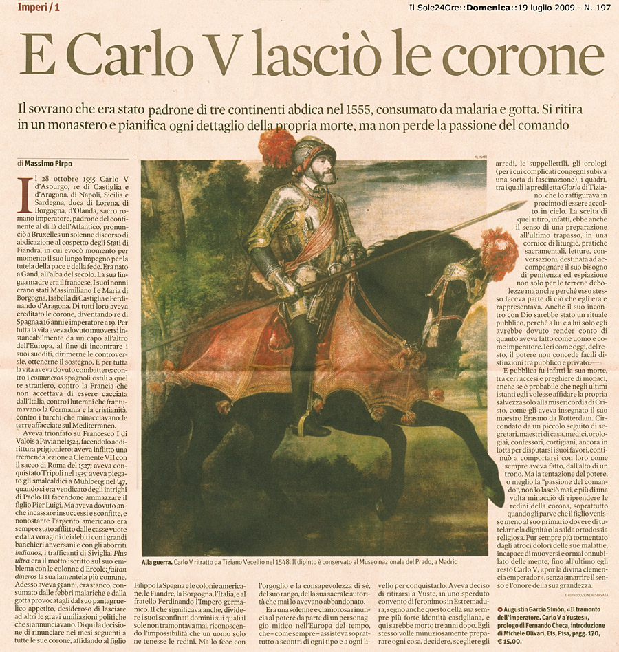 Carlo V a Yuste è un uomo che si apparta dalla corte e dal mondo per aspettare la morte nella solitudine e nel raccoglimento della preghiera. Ma è anche un uomo preoccupato per le sorti dei propri regni, ereditati dal giovane Filippo II, ancora poco avvezzo, secondo il padre, alla dissimulazione e alle arti del mascheramento, e troppo esposto al covo di discordie e di agguati che si annida intorno al potere. Nel palazzo che Carlo V ha fatto costruire vicino al monastero dell'ordine di San Gerolamo decide di trascorrere giorni ameni di meditazione e di studio. Continua a tormentarlo, tuttavia, non solo la prossimità della morte e l'incognita della salvezza eterna, particolarmente problematica per un re, quanto l'esigenza di sorvegliare gli affari di stato con occhio vigile e fermo, pur consapevole di essere soltanto un'ombra sul palcoscenico della politica. La decadenza fisica e la malattia sono le piaghe di un tormento non minore, anche se lenito dalla presenza di una corte in miniatura che, nell'assisterlo e compiacerlo costantemente, replica i fasti di una gloria terrena che sta ormai vivendo il suo tramonto.