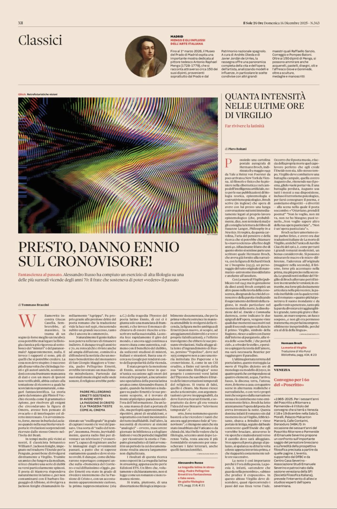 «Captata attraverso lo spazio una tragedia di 22 secoli fa»: con questo titolo a caratteri cubitali a tutta pagina un rotocalco italiano, nell’ottobre del 1973, rilanciava con grande evidenza una storia caratterizzata da un insolito mix di elementi fantascientifici ed eruditi e che continua ad avere una incredibile fortuna a livello mondiale nella pubblicistica popolare nonché in innumerevoli siti sulla rete: un monaco benedettino, padre Pellegrino Ernetti (1925-1994), grazie a una macchina del tempo, affermava di aver assistito alla prima rappresentazione di una tragedia del poeta latino Quinto Ennio (239-169 a.C.), che si tenne a Roma nel 169 a.C., e di averne così ricostruito per intero il testo che, come quello della quasi totalità delle altre opere latine di quell’epoca, era andato perduto.