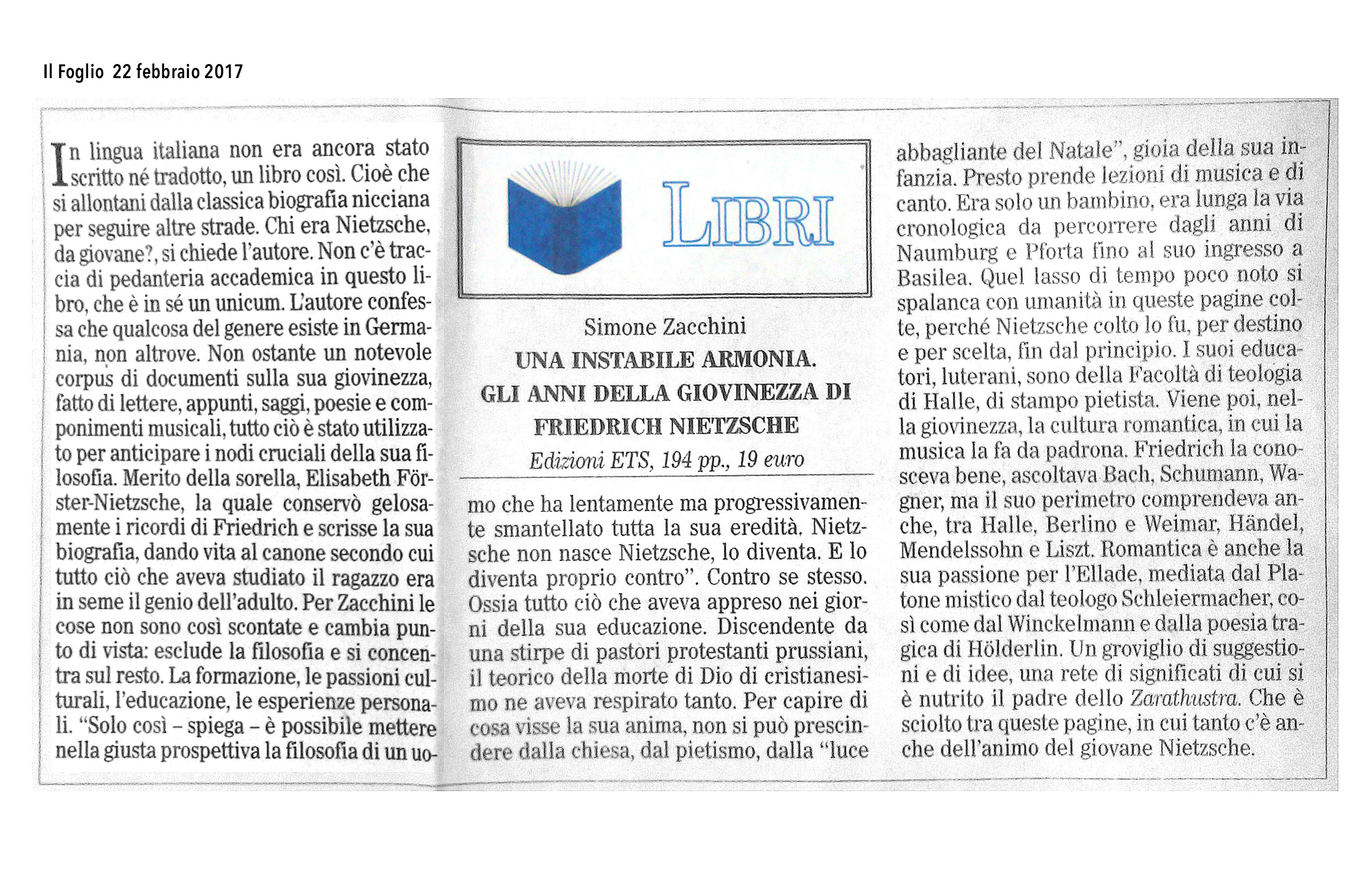 Simone Zacchini è ricercatore in storia della filosofia presso l’Università degli Studi di Siena (sede di Arezzo). Si è occupato a lungo delle composizioni musicali di Nietzsche, in relazione alla sua biografia e al suo pensiero, a partire dalla pubblicazione Al di là della musica. Friedrich Nietzsche nelle sue composizioni musicali (Milano 2000). Ha inoltre dedicato saggi e libri alla filosofia della musica, alla fenomenologia e al pensiero contemporaneo. Recentemente, La collana di Armonia. Kant, Poincaré, Feyerabend e la crisi dell’episteme (Milano 2010).