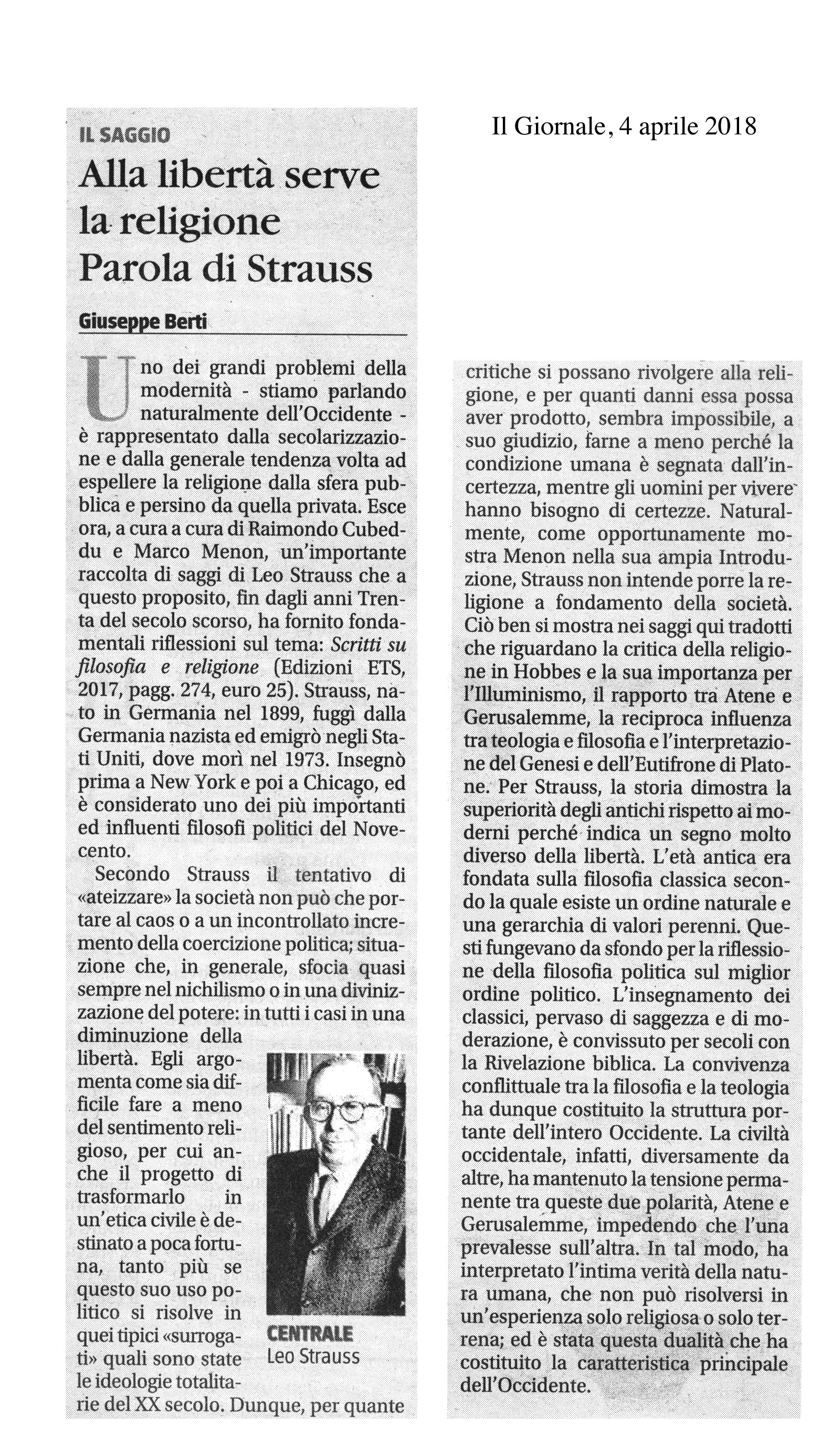 Raimondo Cubeddu insegna Filosofia politica all’Università di Pisa e ha pubblicato il suo primo libro su Strauss nel 1983. Si occupa di Liberalismo, in particolare della Scuola Austriaca; ha scritto libri e saggi su molti dei suoi esponenti e ne ha curato edizioni.