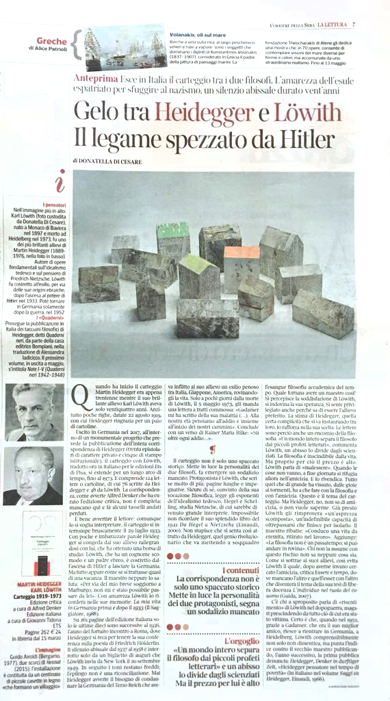 I tentativi di Löwith di entrare in autentico contatto con un maestro la cui grandezza di pensiero rappresentava un ingombro invalicabile si rivelano per quello che erano, mostrano cose del passato / mai raggiunte, destinate a rinuncia (documento 122). La relazione tra i due si configura come un parricidio mancato e viene posta al termine del carteggio sotto una luce che attende. Non è dunque una riconciliazione quella che suggella l’epistolario, bensì la riconferma, sub mutata specie poetica, del carattere di apertura irrisolta di un rapporto già da sempre datosi esattamente nel modo in cui uomini isolati possono stare autenticamente insieme: nell’esistenza (documento 25).
