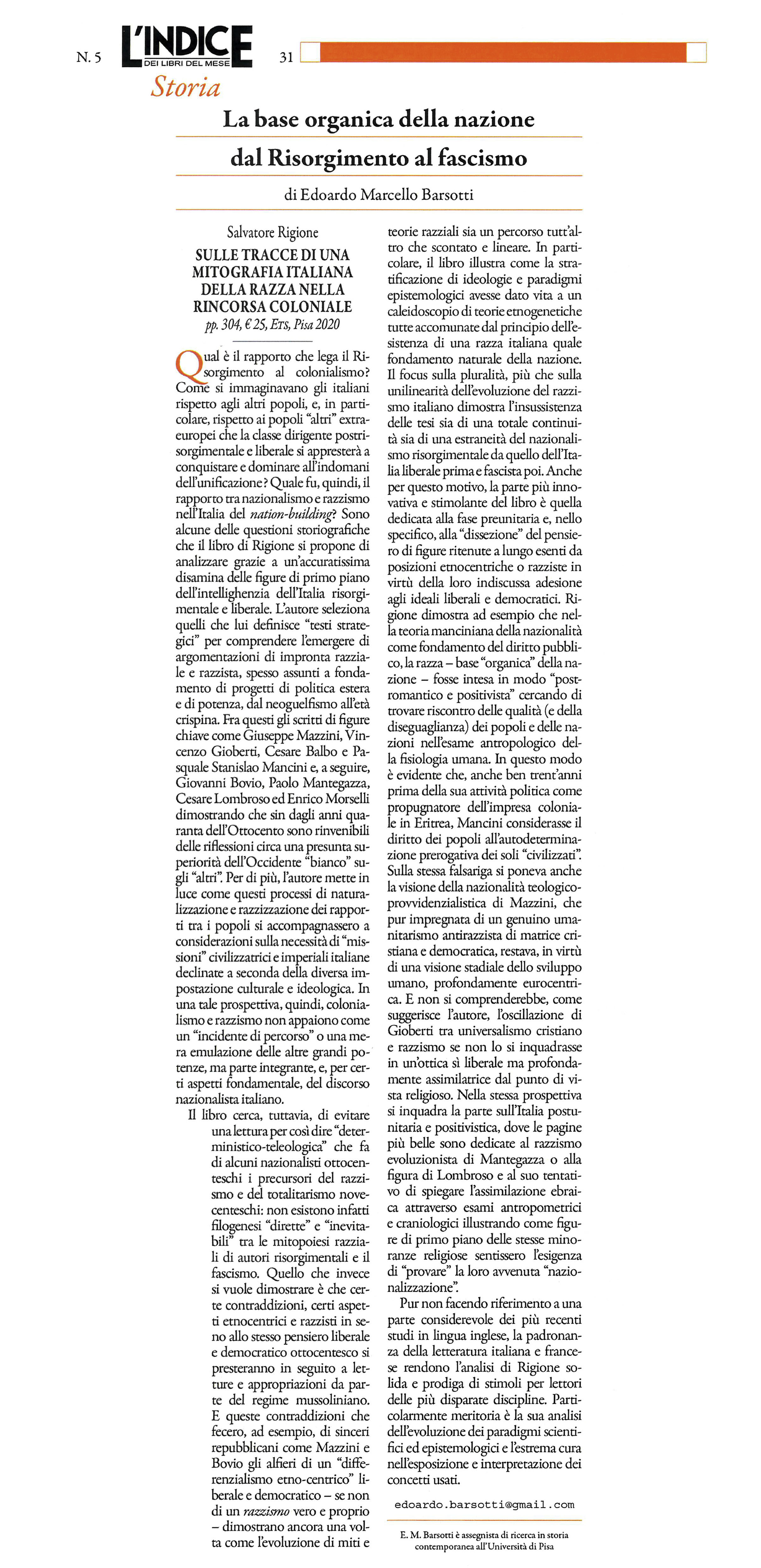 Questo libro affronta le distinte narrazioni del lemma razza dalla formazione risorgimentale dello Stato agli albori del nazionalismo, includendo le istanze della politica italiana di potenza. Dalla puntuale rilettura di testi fondamentali emergono le posizioni di figure rilevanti del Risorgimento e della fase postunitaria: Mancini e Mazzini, Gioberti, Balbo e Campo Fregoso, Bovio e Marselli, poi gli antropologi Mantegazza, Lombroso e Sergi fino a Morselli. Si mettono inoltre in risalto i protagonisti della lotta per la seconda emancipazione ebraica e valdese e, sul fronte dell’antirazzismo, Ghisleri e il suo gruppo, Colajanni e il dreyfusardo Paulucci di Calboli fino a Mondaini. Attraverso queste diverse prospettive Rigione delinea così i tratti diversificati di una «mitografia italiana della razza», rappresentando il lascito teorico più gravido di conseguenze del laboratorio politico italiano tra la fine dell’Ottocento e il primo decennio del Novecento, che confluirà nel nazionalismo imperialistico e nel razzismo fascista.