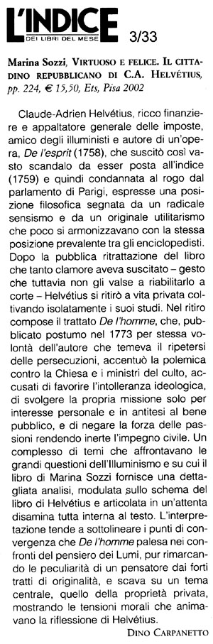 Helvétius propone una sorta di terza via, che, pur confermando la sua fiducia nella capacità dell’uomo di modificare gli assetti politici e istituzionali in modo da garantire un progresso delle società, non minimizza affatto tutti i rischi di dissoluzione e di regresso che si annidano nel continuo riproporsi delle disuguaglianze sociali.