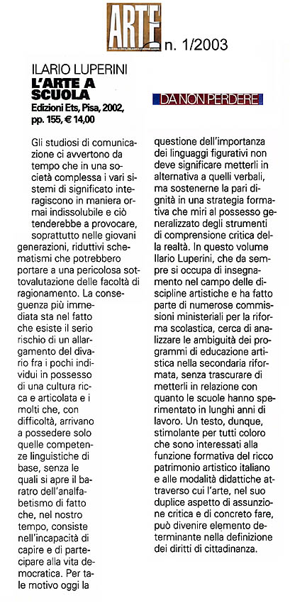 Una particolare attenzione è rivolta alla riforma della scuola secondaria, forse il segmento più delicato di tutto il processo di ripensamento dei cicli scolastici. Il problema dell’istruzione artistica, cioè di un settore specifico che formi operatori competenti nei vari rami delle arti, viene affrontato con una visione storica e nelle dinamiche vive e presenti dell’attuale fisionomia degli istituti d’arte e dei licei artistici. Un volume, dunque, stimolante per chiunque voglia interessarsi della funzione formativa del ricco patrimonio artistico italiano e delle modalità didattiche attraverso cui l’arte, nel suo duplice aspetto di assunzione critica e di concreto fare, può divenire elemento determinante nella definizione dei diritti di cittadinanza.