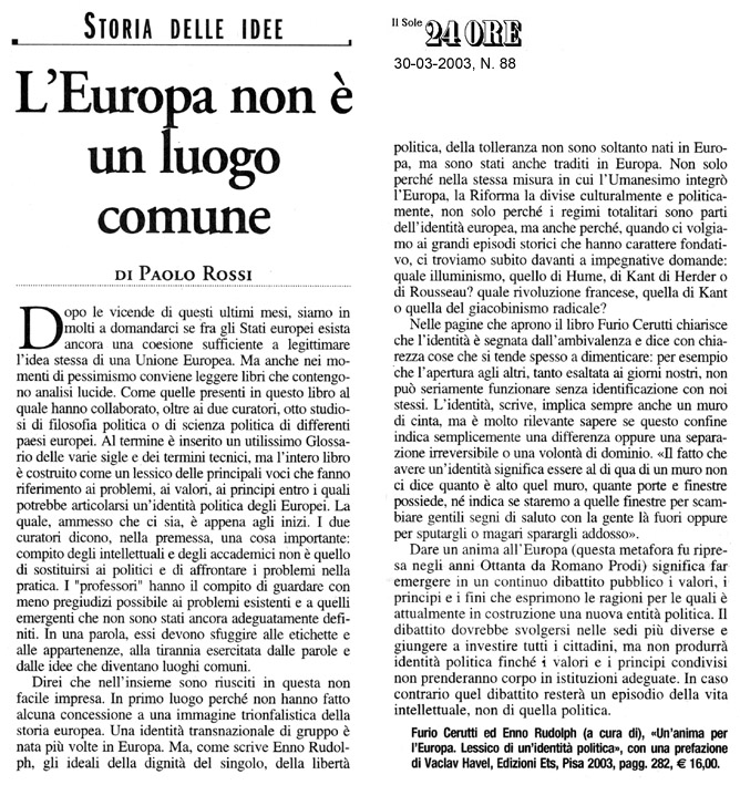 Nota dei curatori; Ringraziamenti; Prefazione, di Vaclav Havel. Verso l'identità politica degli europei. Un'introduzione, di Furio Cerutti. La democrazia europea e il principio della tolleranza costituzionale: l'anima dell'Europa, di Joseph Weiler; Un cemento per l'Unione: il ruolo della cittadinanza europea, di Richard Bellamy e Alex Warleigh; Giustizia e solidarietà, di Mario Telò e Paul Magnette; L'anima dell'Europa: libertà e diritti, di Guy Haarscher; Pace e guerra nella coscienza europea, di Furio Cerutti; Confini, di Rémi Brague; Manifestazioni storiche e fallimenti dell'identità europea, di Enno Rudolph; Lo stato dell'Unione, di John Fitzmaurice; Glossario, a cura di D. D'Andrea. Gli autori. I curatori. Indice del II volume di A Soul for Europe.