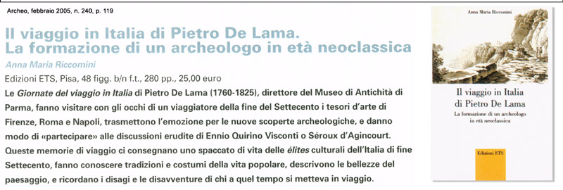 Quali erano, alla fine del Settecento, le tappe formative di un archeologo destinato a dirigere un importante museo di antichità, quali i legami che univano un centro culturalmente vivace ma periferico come il Ducato di Parma con i più illustri esponenti dell’antiquaria romana, i maggiori circoli letterari, i cenacoli artistici più all’avanguardia? Le Giornate del viaggio in Italia di Pietro De Lama, direttore del Museo di Antichità di Parma, permettono di visitare con gli occhi di un viaggiatore dell’epoca i tesori d’arte conservati nei palazzi di Firenze, Roma e Napoli, di provare l’emozione delle nuove scoperte archeologiche, di assistere alle riunioni letterarie dell’Arcadia, di incontrare i maestri del nuovo gusto neoclassico, come Angelica Kauffmann o Philipp Hackert, di partecipare alle discussioni erudite di antiquari del calibro di Ennio Quirino Visconti o Séroux d’Agincourt. Gli interessi enciclopedici, di chiara matrice illuminista, del De Lama non trascurano il sapere scientifico, spingendoci a visitare i Gabinetti e i Musei di Storia Naturale, a partire da quello celeberrimo di Firenze, o le raccolte private di conchiglie, fossili, rocce vulcaniche e altre curiosità.