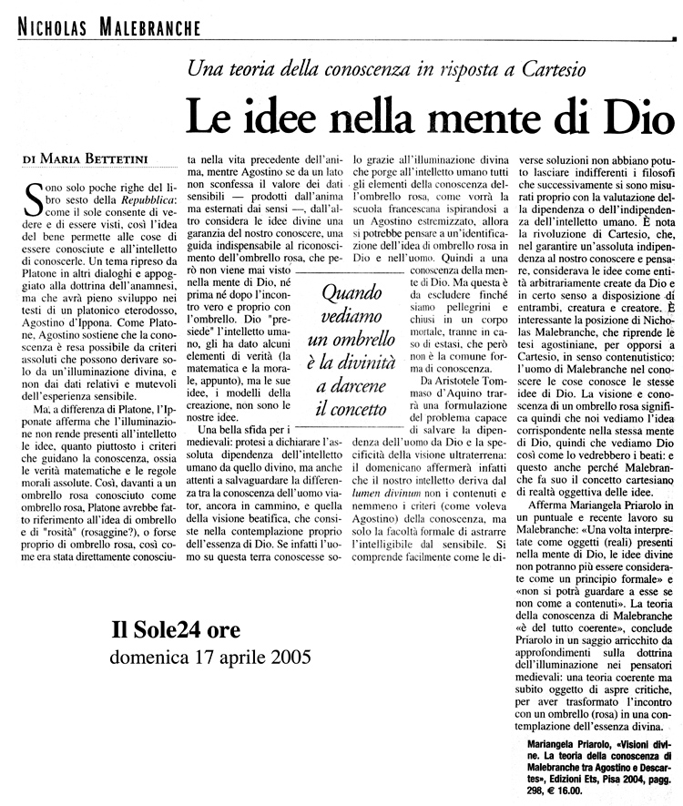Sebbene venga oggi catalogato come un pensatore ‘minore’, Nicolas Malebranche (1638-1715) fu uno dei filosofi più influenti del proprio secolo. Col suo pensiero si confrontarono infatti moltissimi autori, sia in Francia che nel resto d’Europa, filosofi che rispondono ai nomi di Leibniz, Locke, Berkeley, Voltaire e Hume e che videro in Malebranche uno dei maggiori esponenti del cartesianesimo. La progressiva perdita di interesse per la sua opera è quindi probabilmente frutto della presenza massiccia di temi e riferimenti religiosi che nascondono spesso la rilevanza filosofica di molte riflessioni. Questo saggio si propone così di indagare una delle tesi malebranchiane più controverse, la «visione in Dio delle idee», cercando di mostrarne, da un lato, i presupposti epistemologici – in particolare la definizione dell’idea di Cartesio e la dottrina dell’illuminazione divina di Agostino – e di ricostruire, dall’altro, il contesto teorico in cui essa si colloca.