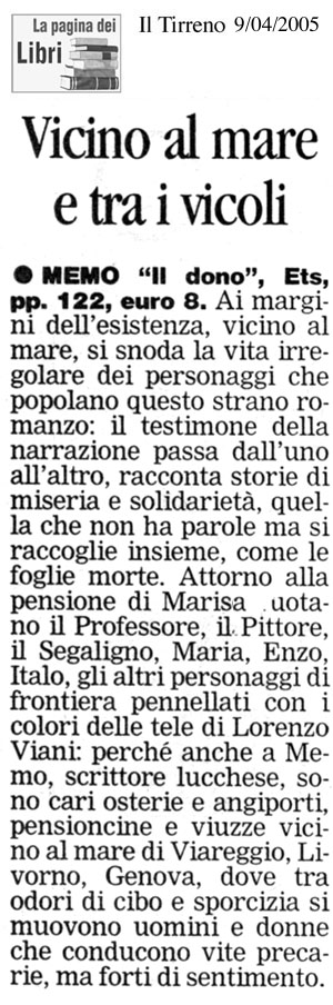 Lo chiamavano “Il Professore”. Portava un grosso cappello nero e cercava sempre il mare. Questo libro è la sua storia. Ma è anche la storia della pensione “Il Dono” e dei suoi insoliti abitanti: Marisa, la conduttrice, un pittore solitario, una giovane prostituta, un metodico portiere. Poi un ragazzo che vuole fare il giornalista. Alla fine un omicidio, ’indagine, la follia… e quelle lacrime sul volto del “Professore”…
