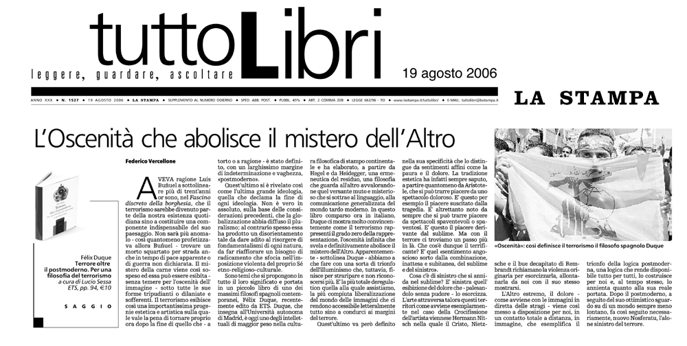 L'interpretazione dei fondamenti teorici del terrorismo islamico alla luce di capisaldi decisivi della tradizione occidentale - dalla Bibbia alla filosofia della storia - offre una chiave di lettura che smonta decisamente la tesi, superficiale e rassicurante, dello "scontro di civiltà". Un'analisi filosofica serrata dell'arte contemporanea (dalla scultura all'architettura, dalla body art al cinema) che viene letta in base a due categorie apparentemente simili, ma in realtà contrastanti: l'orrore e il terrore. Titolo originale: Terror tras la postmodernidad, Madrid 2004. INFO: http://www.edizioniets.com/anteprime/Duque_terrorismo_88-467-1356-7