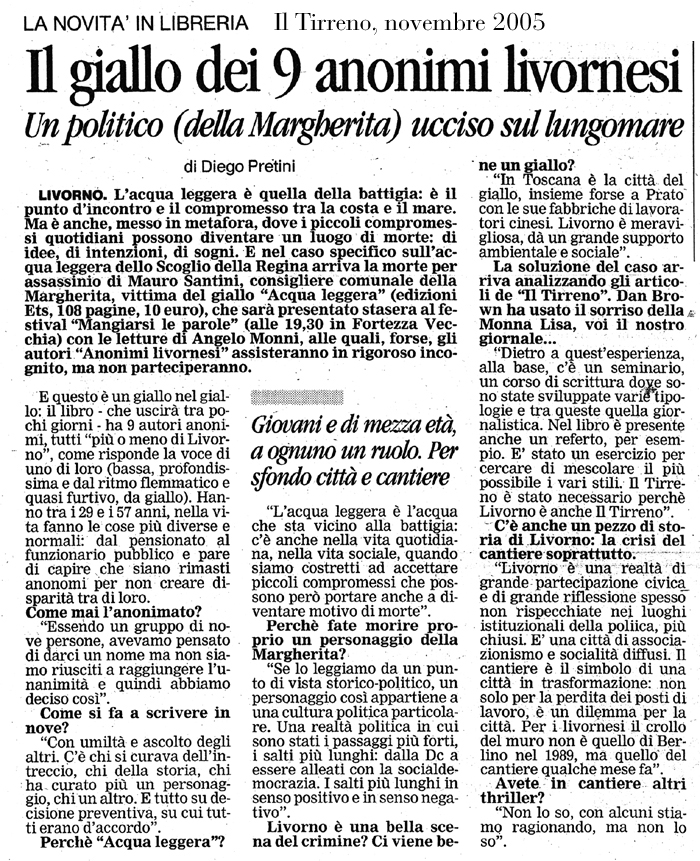 Franco ti dirò tutto perché ho visto tutto e so tutto, al tuo amico marocchino non ci avevo proprio fatto caso e i due picchiatori li ho intravisti che scivolavano via lungo il muro del cantiere verso piazza Orlando, il Santini invece l'ho visto e ci ho parlato, seduti sul muretto perché lui non ce la faceva a muoversi, quando ho cercato di aiutarlo ad alzarsi, mugolava dal dolore, dovevano averlo picchiato addosso perché in faccia era a posto, erano stati bravi i due stronzi. Il cadavere di un politico del centrosinistra, un marocchino che vende la frutta, un vecchio fatto di sangue, gli scioperi al cantiere e gli yacht di lusso, il gruppo del Manifesto e gli anni '70, i pensionati e i pescatori dei Novi Lena, un fornaio e una bella avvocatessa...