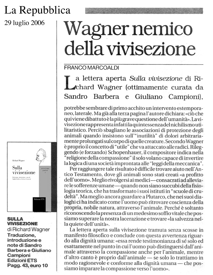 La lettera aperta di Richard Wagner contro la vivisezione è uno scritto ricco di presupposti culturali e filosofici, espressione tra le più significative dell'ideologia del musicista. La vivisezione - che Turgenev in Padri e figli aveva elevato a metafora del nichilismo moderno - è in Wagner l'emblema di una tracotanza tecnico-civilizzatoria che nella sua concezione puramente strumentale della natura ne causa la distruzione. Le "camere di tortura della scienza" sono un dispositivo di morte, come la cupa torpediniera corazzata che, in una visione coeva a questo scritto, determina la deflagrazione dell'intero pianeta. La sofferenza senza riscatto degli animali è il banco di prova di una filosofia della redenzione, basata sul sentimento della compassione verso tutti gli esseri viventi, che troverà la sua espressione più nota nelle grandi trame narrative di Parsifal. Nella loro introduzione, i curatori ne mostrano le fonti filosofiche e le ampie risonanze nella cultura del secondo Ottocento: fino a Nietzsche, che nella compassione di Wagner vede i malcelati tratti di un sentimento di potenza e di dominio.