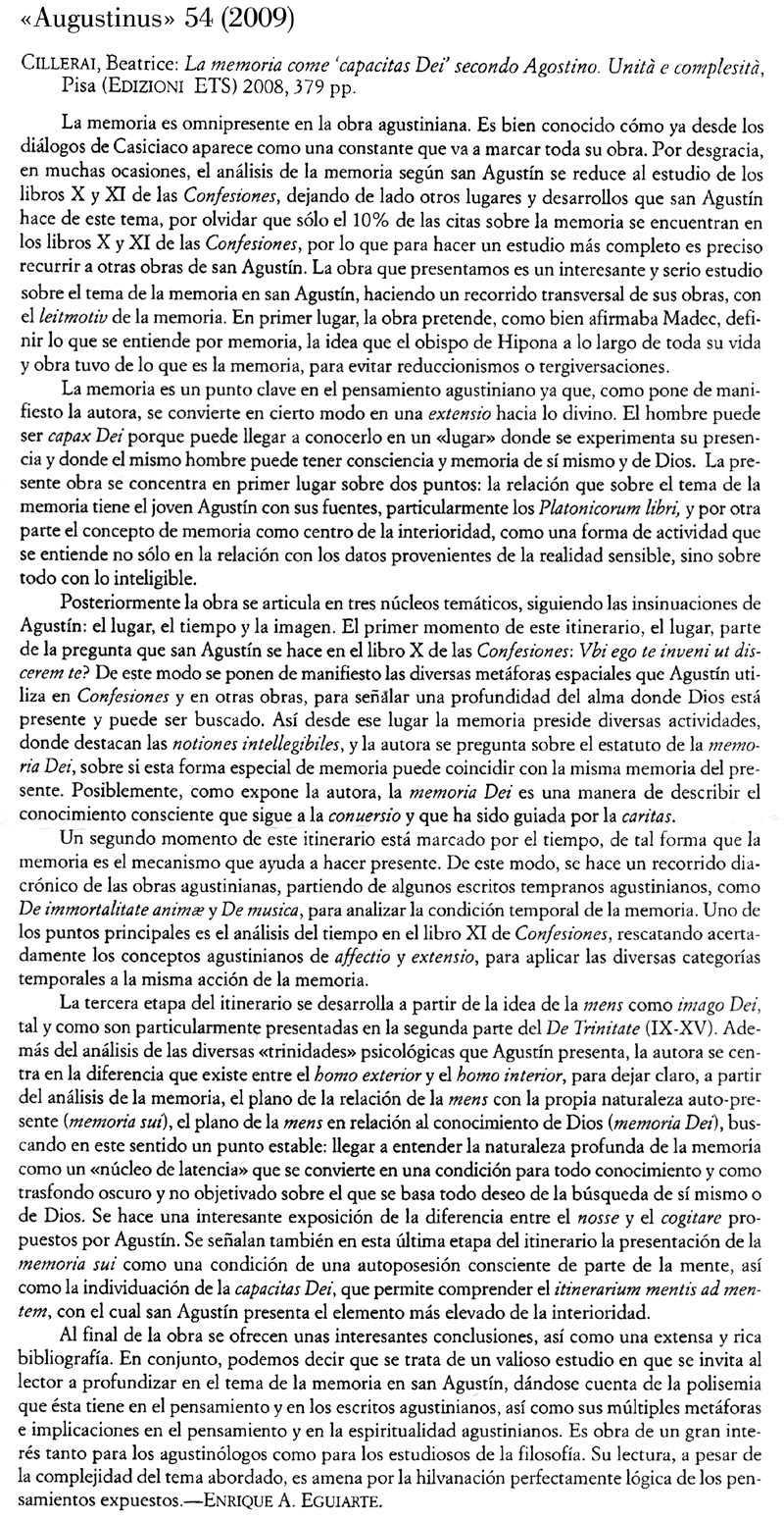 Il saggio ripercorre, attraverso tre diversi itinerari (il luogo, il tempo, l’immagine), questa densa riflessione agostiniana ed individua in essa un movente costante: tendere a Dio sondando le profondità dell'animo umano. La memoria incarna l'enigma e svela il mistero di quelle profondità: in quanto 'spazio metafisico' essa è la radice prima ed ultima della possibilità umana di autotrascendersi rispondendo al richiamo di Dio che ha creato l'uomo capace di Lui.