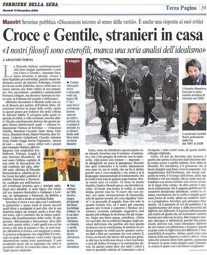 A partire da questo sfondo Emanuele Severino discute le posizioni di alcuni filosofi italiani che hanno rivolto critiche e obiezioni al suo pensiero: da Massimo Cacciari a Vincenzo Vitiello, da Carlo Arata a Umberto Galimberti, da Massimo Donà a Vero Tarca, solo per citarne alcuni. Per Severino non solo c'è una dimensione comune sia alla concezione tradizionale della verità, sia alla distruzione di tale concezione – quella operata appunto dal pensiero filosofico del nostro tempo.