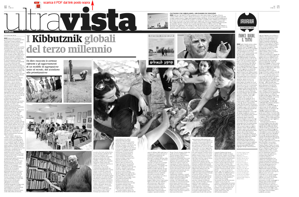 Dall'applicazione reale del concetto di proprietà comune, alle nuove forme di coesione sociale in Israele: viaggio nelle radici storiche di una filosofia di vita all'insegna della comunità e del solidarismo, il kibbutz. Gli autori hanno percorso Israele da nord a sud, visitato numerosi kibbutz, e intervistato persone che hanno fatto questa scelta di vita, raccontandone i problemi e le tendenze. A cento anni dalla fondazione di Degania, il primo storico kibbutz sorto sulle sponde del lago di Tiberiade, questo libro vuole raccontare "in presa diretta" la storia di questa idea e della sua applicazione. Non solo per conoscerla, ma anche per coglierne quegli aspetti che nella nostra società potrebbero essere assimilabili, o che già esistono in forme non immediatamente riconoscibili. "Kibbutz 3000" è arricchito dalle immagini di Nili Bassan, nota fotografa israeliana, che ha accompagnato Enrico Catassi e Alfredo De Girolamo nel loro viaggio-inchiesta. Enrico Catassi e Alfredo De Girolamo, attenti analisti e commentatori del contesto mediorientale, hanno pubblicato per ETS In nome di. Conflitti in Terra Santa nelle foto di Nili Bassan e Gerusalemme ultimo viaggio. Nove diari. Nili Bassan, fotoreporter israeliana, sue immagini hanno riempito le pagine di quotidiani israeliani e internazionali.