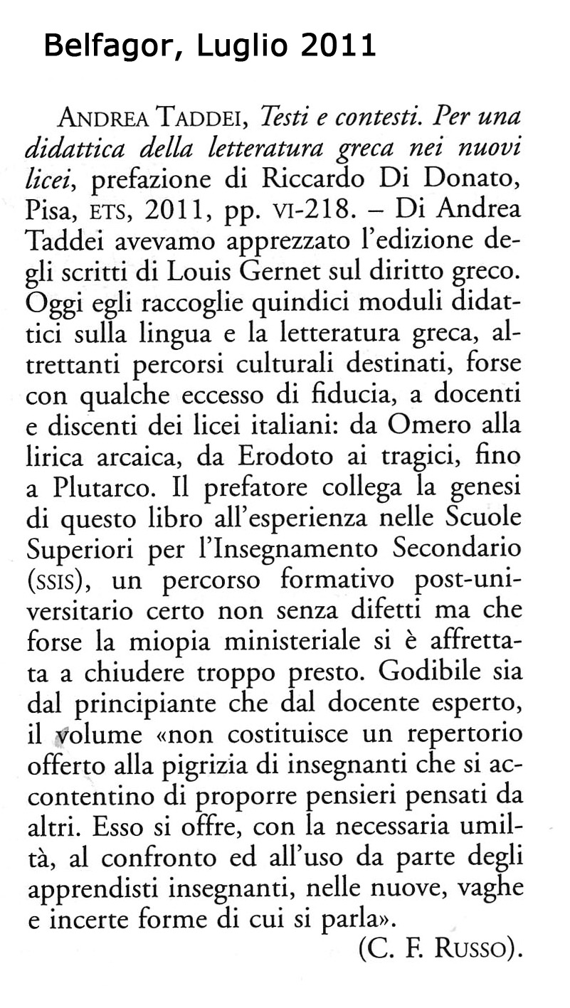 Andrea Taddei è Ricercatore confermato di Lingua e letteratura greca nella Facoltà di Lettere e Filosofia dell'Università di Pisa. Dal 2007 insegna Antropologia del Mondo Antico nel Corso di Laurea Specialistica in Filologia e Letteratura dell'Antichità. Ha insegnato Didattica del greco al secondo anno della Scuola di specializzazione per l'insegnamento secondario, ha tenuto per alcuni anni il Laboratorio di lingua greca per gli studenti del primo anno di Lettere antiche e, per il Corso di laurea in Scienze dei Beni culturali, il corso di Civiltà greca.