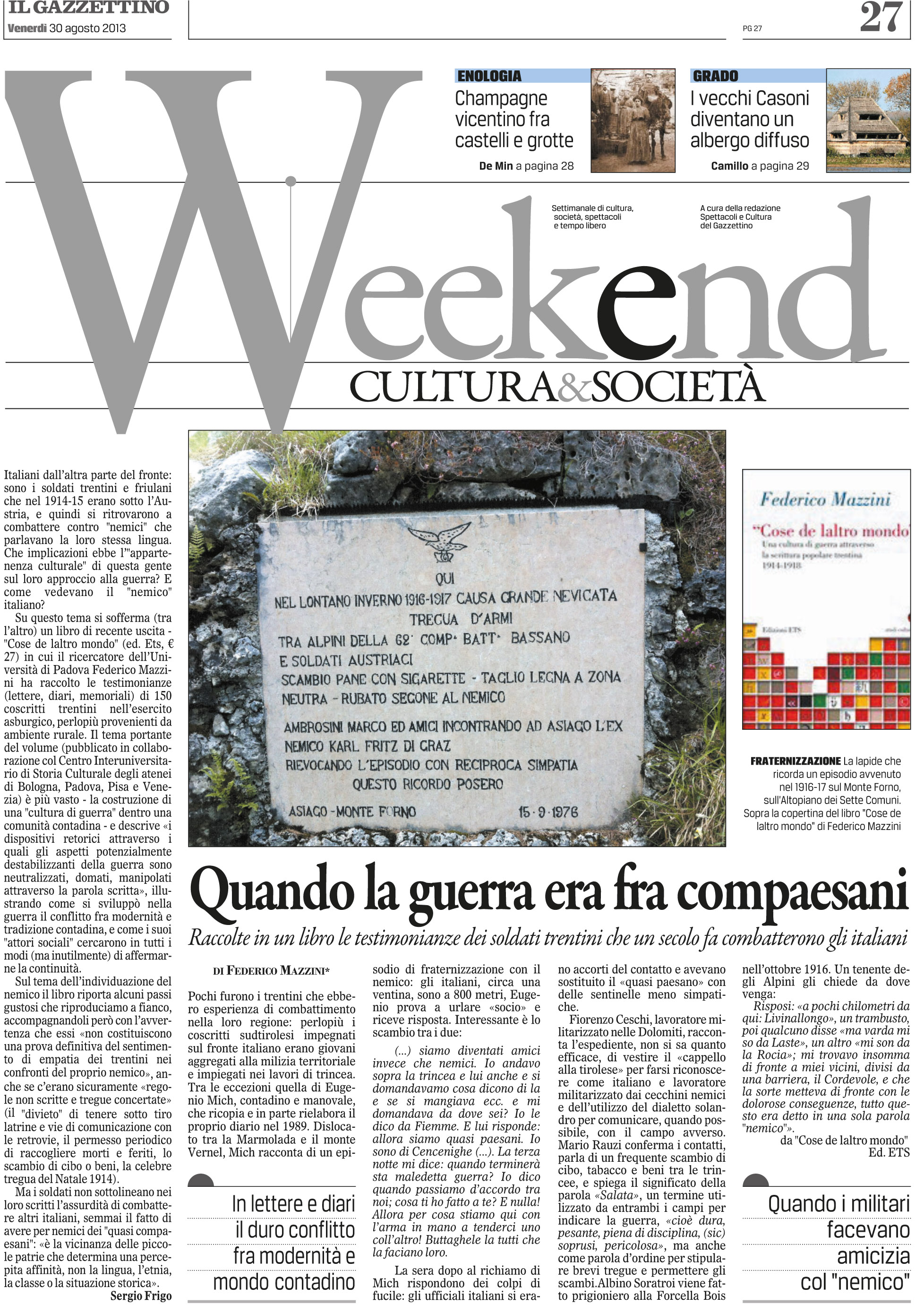 La Grande Guerra fu un enorme "esperimento di psicologia sociale": nelle trincee si incontrarono e si scontrarono uomini di classe, provenienza e cultura diversa. La storiografia ha posto l'accento sull'effetto omogeneizzante della guerra totale, fino a parlare di una "cultura di guerra" di scala europea. Questo volume insegue la nozione di cultura di guerra nella scrittura popolare di una singola comunitā contadina, quella del Trentino di inizio secolo sottoposto all'autoritā asburgica, cercando le tracce di uno scontro - quello tra una cultura contadina e l'effetto disgregante della guerra totale - che si č giocato non nella trincea, ma principalmente sulle pagine di diari, memorie e memoriali.