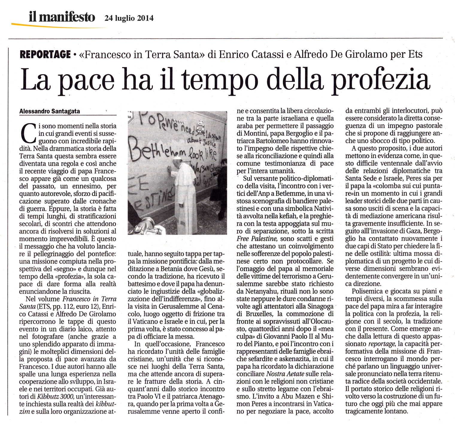 A Gerusalemme ha pregato al Muro del Pianto; a Betlemme ha espresso la sua amarezza di fronte al muro che separa israeliani e palestinesi.