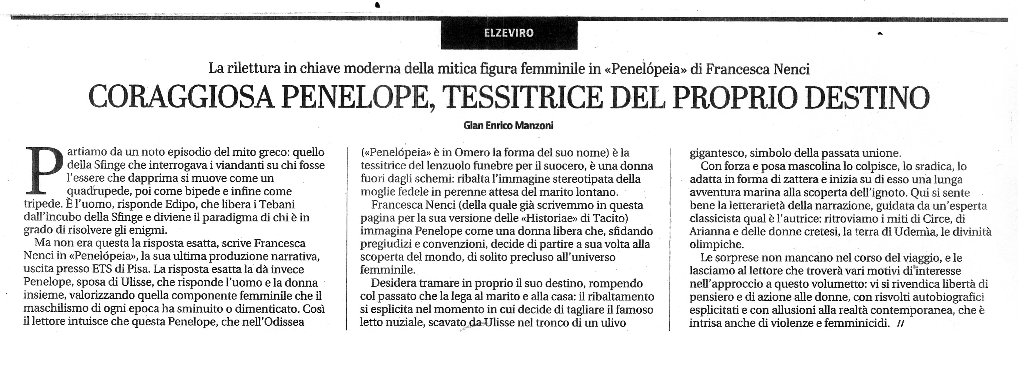 La tela di Penelope, come quella di tutte le tessitrici, è muta: è un dono silenzioso, come lo sono i manufatti delle donne, che non hanno parola; ma l’arte perfetta sublima un dolore perfetto, ed il mito lo stigmatizza e, conferendo assolutezza all’episodio contingente, lo rende archetipo. In Penelopeia l’eroina infrange questa assolutezza, tanto che i colpi battuti sul telaio per tessere la tela della sua nuova vita sembrano risuonare di libertà e di gioia.