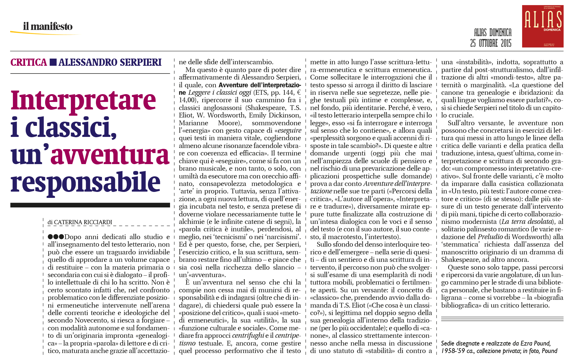 Alessandro Serpieri, anglista e teorico della letteratura, è Professore Emerito nell’Università di Firenze. La sua vasta produzione di critico, traduttore, commentatore e curatore di testi spazia da Shakespeare e il teatro elisabettiano a Beckett e T.S. Eliot passando per John Donne, i Romantici, Conrad, G.M. Hopkins e numerosi altri. Prestigiosi i premi ricevuti per la sua attività traduttiva (Premio Mondello 1992, Premio Monselice 1998, Premio Grinzane 2009). Le sue molte versioni di drammi shakespeariani sono state messe in scena da alcune delle più importanti compagnie nazionali.