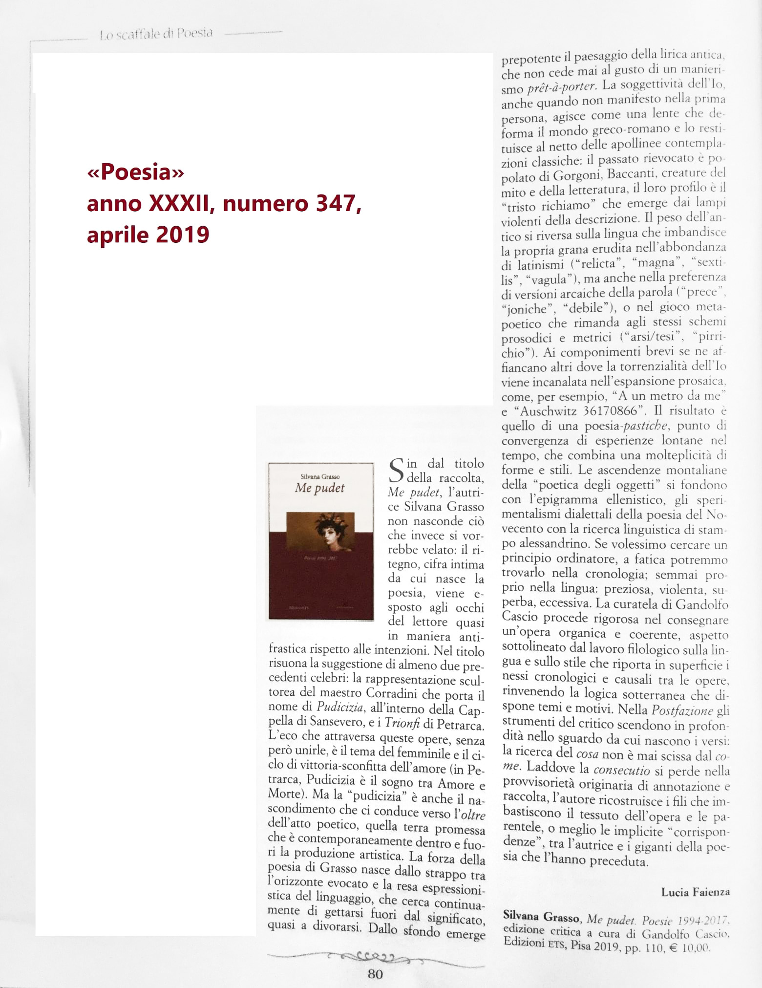 Nella prosa di Silvana Grasso si riscontra un continuo, quasi ossessivo, ricorso a forme metriche che rimandano ai ritmi della lirica e dell’elegia. Di ciò s’erano accorti elegantissimi lettori, convinti che nei suoi cassetti dovessero nascondersi delle poesie. Avevano ragione. Ora viene pubblicato per la prima volta l’intero corpus; per quanto il titolo – Me pudet – rammenti la ritrosia e il disagio dell’autrice a esporre la parte più segreta e seducente della sua scrittura. Da una silenziosa e appartata cameretta Silvana Grasso guarda il mondo, le creature miti (e sempre giovani), l’impietosa natura. Così ha composto il suo canzoniere, scandaloso e pudico, che narra vicende minime e che, in quanto tali, riguardano tutti.