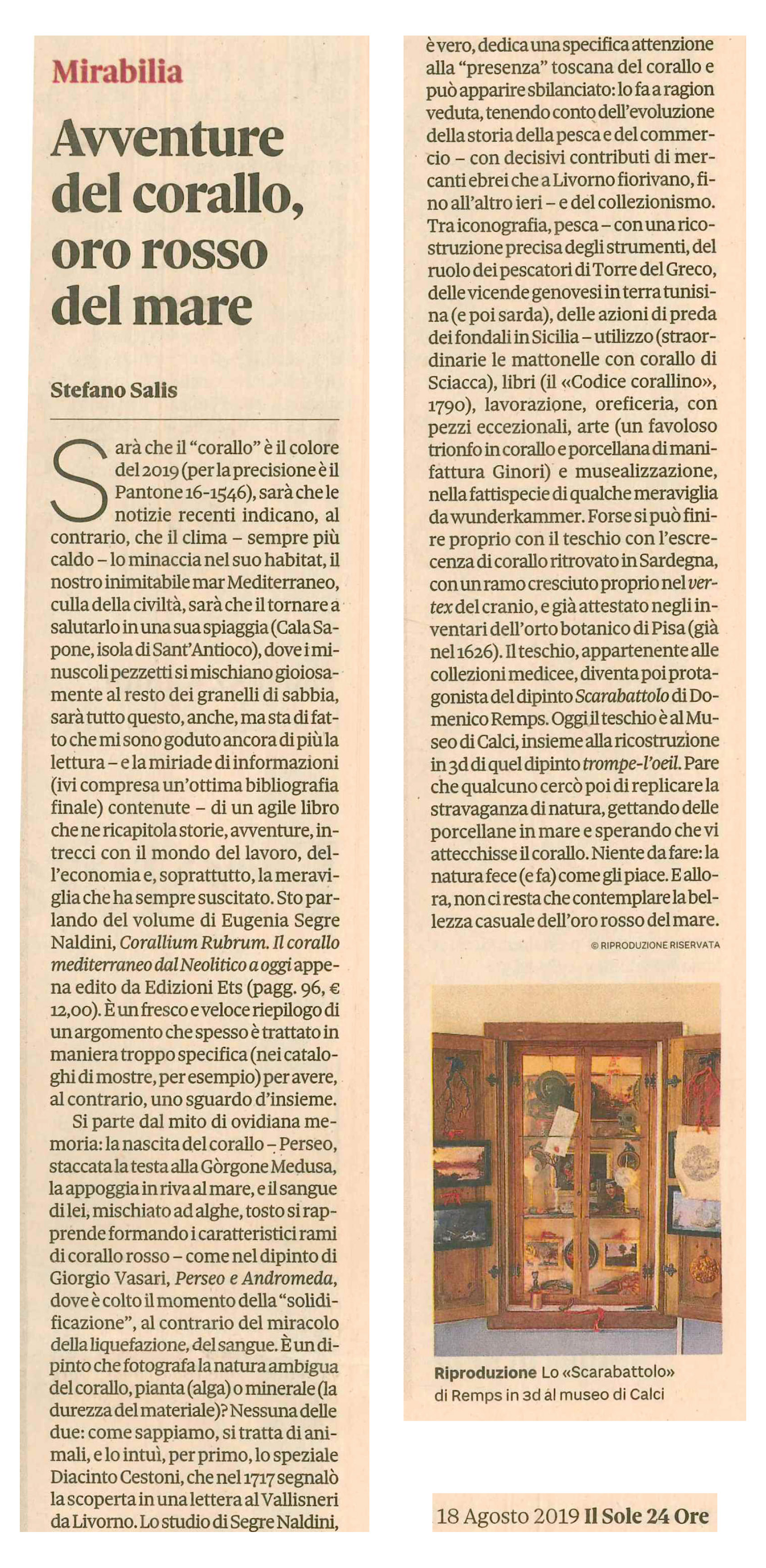 Viene qui presentata la lunga storia del Corallium rubrum tipico del Mediterraneo: il sistema della pesca, la lavorazione e il commercio dalla più remota antichità ad oggi. Notizie sul corallo rosso e sulla sua pesca si hanno tra gli altri da Plinio il vecchio nel suo Naturalis Historia. Per le sue sembianze arborescenti il corallo fu assegnato al mondo vegetale e tale convinzione perdurò per secoli fino al 1700 quando la sua appartenenza al mondo animale fu riconosciuta dallo speziale Diacinto Cestoni, come è testimoniato da una lettera dallo stesso inviata da Livorno il 3 settembre 1717 al Vallisneri. Nel 1727 Peyssonel, medico della marina francese inviato sulle coste algerine per studiarne l’ambiente, arrivò alle medesime conclusioni; infine, a metà del 1800 Lacaze Duthiers, valente scienziato francese, definì i caratteri biologici e il ciclo evolutivo del corallo rosso mediterraneo. I primi ritrovamenti in Italia di coralli lavorati risalgono al neolitico antico (datati col metodo del C14 a 6487 ± 175 da oggi) si tratta di pendaglietti usati come talismani o filze di tondi usati a scopi religiosi. Le repubbliche marinare e in particolare Pisa, ma anche Amalfi, Venezia e Genova, si dedicarono alla pesca e lavorazione del corallo rosso. Attraverso Venezia, la via della seta e il delta del Nilo veniva raggiunto, via terra, l’Estremo Oriente, e a nord la Cina settentrionale, dove a Kaifeng si era stabilita fin dall’anno 1000 a.C. una comunità ebraica. Si illustra anche il passaggio di Livorno da piccolo borgo di pescatori a grande città, nella quale ebbe un ruolo importante la manifattura del corallo legata alla presenza della comunità ebraica che inviò il corallo non soltanto nei più importanti porti mediterranei, ma anche a Londra e in Asia.