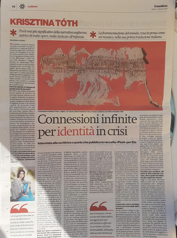 Krisztina Tóth, scrittrice, poetessa, una delle voci più importanti della letteratura ungherese contemporanea. Ha al suo attivo venticinque libri, tradotti in più di una dozzina di lingue, tra cui tedesco, francese, polacco, finlandese, svedese, ceco e spagnolo. Pixel è il primo ad essere tradotto in italiano. Dal 2005 tiene seminari di traduzione e corsi di scrittura creativa. Le sono stati conferiti riconoscimenti e premi sia nazionali sia internazionali per l’attività di poetessa e scrittrice, nonché di traduttrice di poesia dal francese. www.tothkrisztina.hu