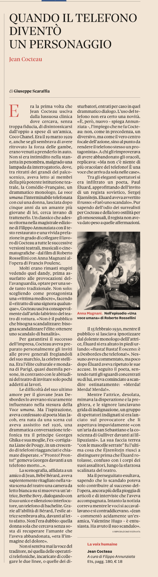 La voix humaine è una delle opere più note e longeve di Jean Cocteau, e ha pieno titolo per rientrare nel canone del Teatro europeo, soprattutto in virtù della sua forza espansiva: il testo ha mostrato sin dalla sua prima rappresentazione una ininterrotta capacità di fornire spunti di rilettura, rielaborazione e citazione che non accenna a diminuire. Il testo, la sua simbologia, il significato che veicola – diretto, ma profondissimo – hanno reso La voix humaine un’icona del nostro tempo. Al suo apparire, nel 1930, La voix humaine fu un lavoro rivoluzionario, sia per la sua struttura (un dialogo-monologo), sia per la centralità che il mezzo di comunicazione, e dunque la tecnologia, rivestono nel contesto della narrazione. Il testo di Cocteau continua a parlarci ancora oggi, trasformandosi e influenzando fonti diverse: dall’opera, alla musica pop, al rock, al cinema.