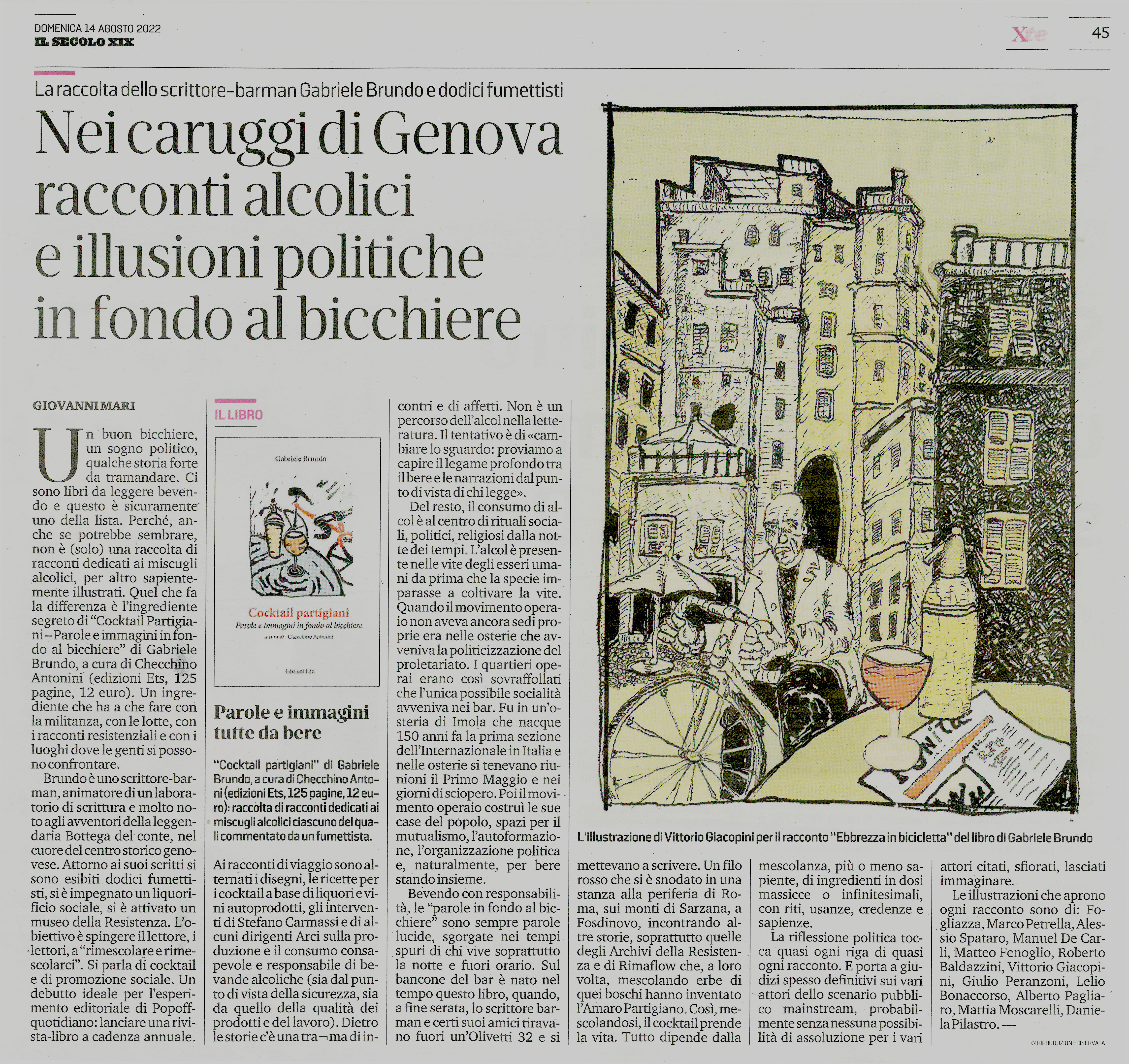 Uno scrittore-barman, dodici fumettisti, un liquorificio sociale, una fabbrica recuperata, un museo della Resistenza, un sito giornalistico di inchiesta e una grande associazione culturale e di promozione sociale: ecco gli ingredienti di Cocktail partigiani, una raccolta di racconti dedicati ai miscugli alcolici ciascuno dei quali commentato da un fumettista. L’autore è Gabriele Brundo, barman di un locale nei caruggi di Genova, animatore di un laboratorio di scrittura. Dal suo incontro con Checchino Antonini, giornalista di Popoff Quotidiano, e con l’Amaro Partigiano – dunque con le esperienze di Rimaflow di Milano e degli Archivi della Resistenza di Fosdinovo (MS) – scaturisce il progetto di mescolare i suoi racconti di viaggio con i disegni, un ricettario di cocktail a base di liquori e vini autoprodotti e gli interventi di Stefano Carmassi e dirigenti Arci di Toscana, Liguria e Roma su produzione e consumo consapevoli e responsabili di bevande alcoliche – sia dal punto di vista della sicurezza, sia da quello della qualità dei prodotti e del lavoro – sui rituali del consumo dell’alcol e della letteratura, su quelli di una socialità da riconnettere e sulla relazione con le reti “fuori mercato” e dell’economia solidale. Un libro per rimescolare e rimescolarci.