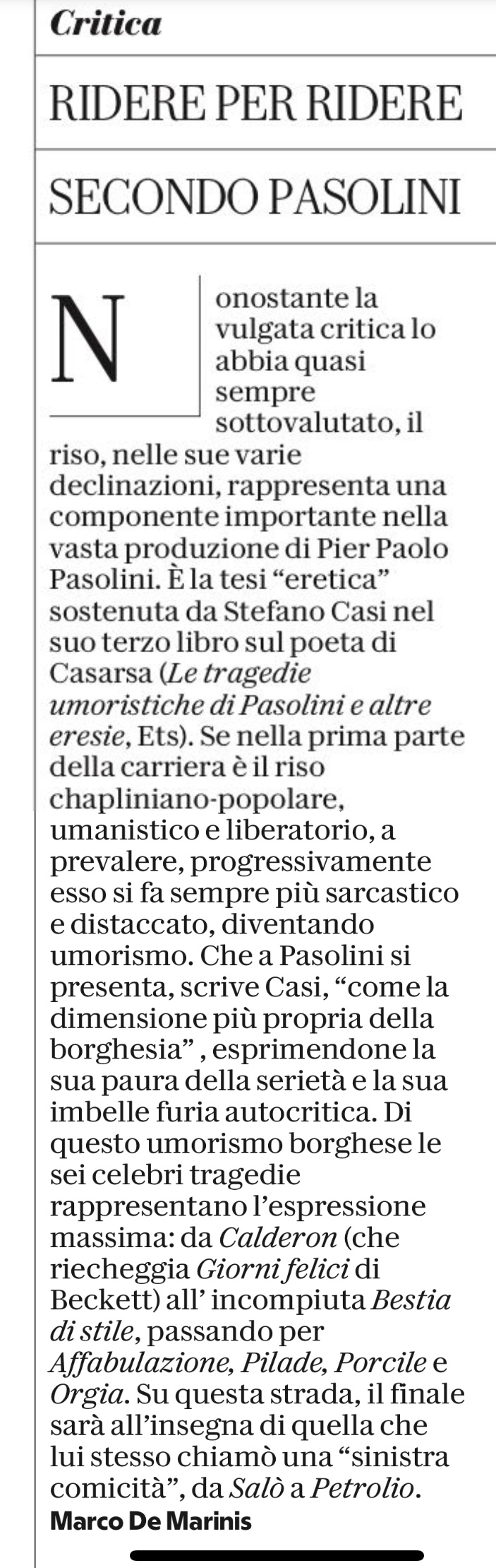 Dal riso popolare di Totò e dalle gag di Chaplin all’umorismo come strumento alienante della borghesia: la comicità attraversa l’opera di Pasolini, seguendo evoluzioni imprevedibili, fino a condizionare fortemente le sue tragedie e l’opera del suo ultimo decennio. L’umorismo nelle tragedie e nell’opera di Pasolini è una delle eresie contenute in questo volume, in cui il suo teatro, in stretta relazione con la poesia, il cinema e la scrittura, è riletto con uno sguardo originale, mettendo in evidenza elementi come la visionarietà che sta alla base del dramma Nel ’46! e il queer che attraversa diverse opere fino a Petrolio, o parentele con autori come Copi, Scaldati e Mishima.