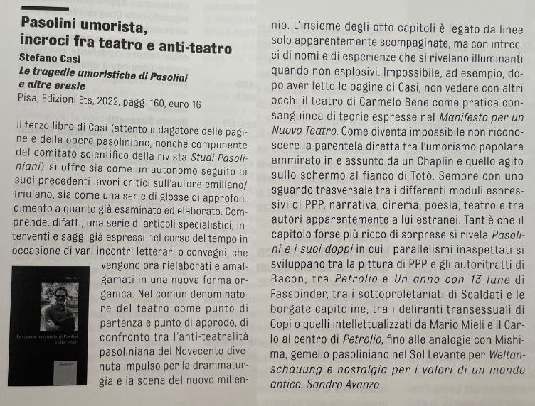 Dal riso popolare di Totò e dalle gag di Chaplin all’umorismo come strumento alienante della borghesia: la comicità attraversa l’opera di Pasolini, seguendo evoluzioni imprevedibili, fino a condizionare fortemente le sue tragedie e l’opera del suo ultimo decennio. L’umorismo nelle tragedie e nell’opera di Pasolini è una delle eresie contenute in questo volume, in cui il suo teatro, in stretta relazione con la poesia, il cinema e la scrittura, è riletto con uno sguardo originale, mettendo in evidenza elementi come la visionarietà che sta alla base del dramma Nel ’46! e il queer che attraversa diverse opere fino a Petrolio, o parentele con autori come Copi, Scaldati e Mishima.
