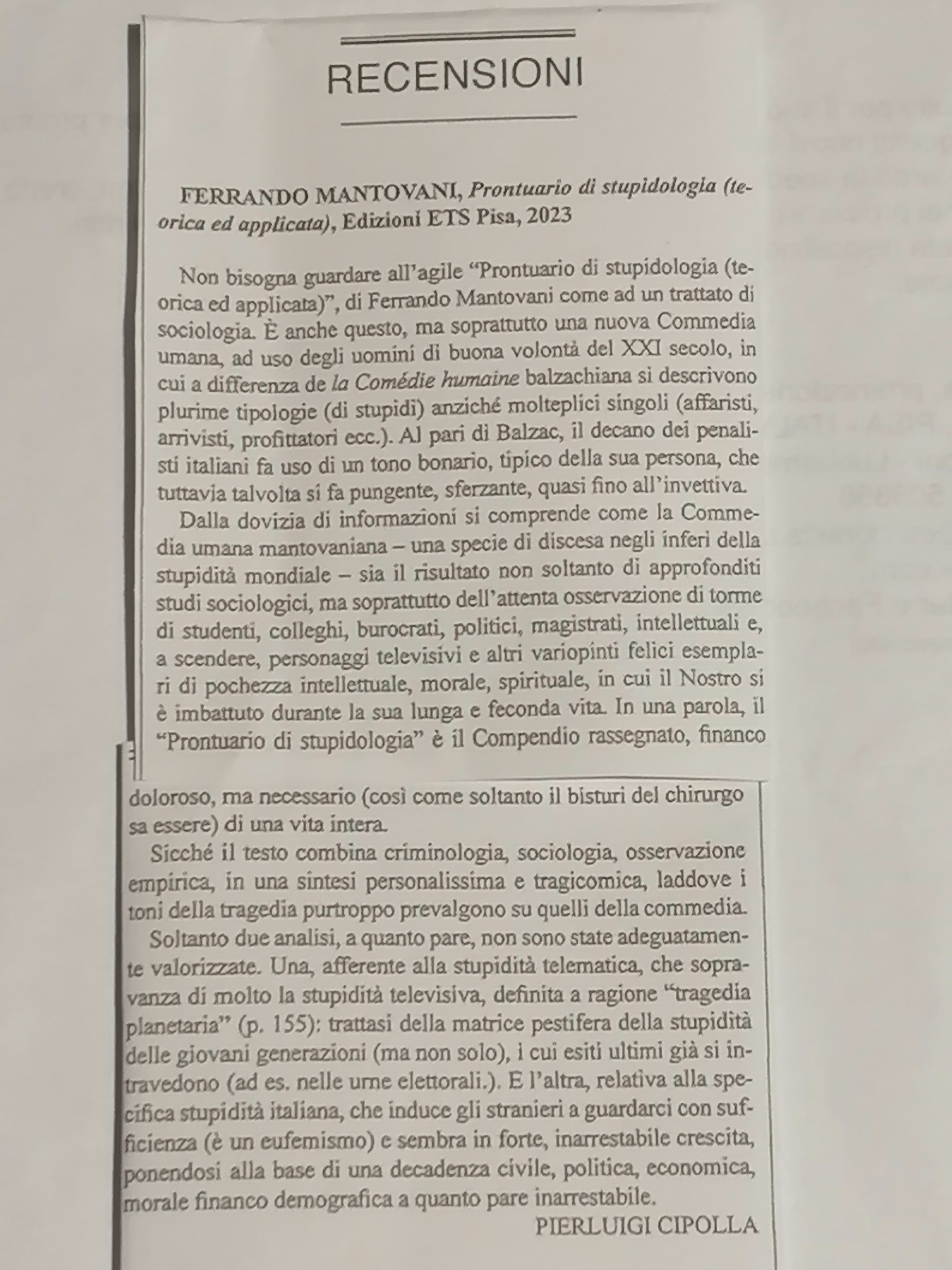 Il presente Prontuario costituisce la sintesi aggiornata dell’aspirante trattato di stupidologia Stupidi si nasce o si diventa? (ETS 2015). E resta anch’esso opera unica sull’argomento. Per la trattazione, tra l’ironico e l’amaro, dei quattro problemi di fondo della stupidologia: la definizione di stupidità come capacità al male e dell’intelligenza come capacità al bene, le cause, le classificazioni della stupidità e la difesa contro di essa. Delle leggi, che regolano questa oscura forza, culminanti con la dirompente legge della progressione e razionalizzazione della stupidità. Delle inesauribili tipologie stupiditarie, coi rispettivi indici di individuazione. E la particolare attenzione, doverosamente riservata alla stupidità politica, intellettuale, televisiva, per la capacità di creare cultura e storia e monopolizzare il Potere. Nonché delle disperate strategie di contenimento della stupidità. E la conclusiva impressione che la maggior parte delle nostre azioni siano più o meno stupide. E che la stupidità abbia sempre governato, governi e governerà il mondo. Ma merito della stupidologia: la riscoperta che siamo noi tutti «fratelli», perciò da amare come noi stessi. Persino i politici e gli intellettuali.